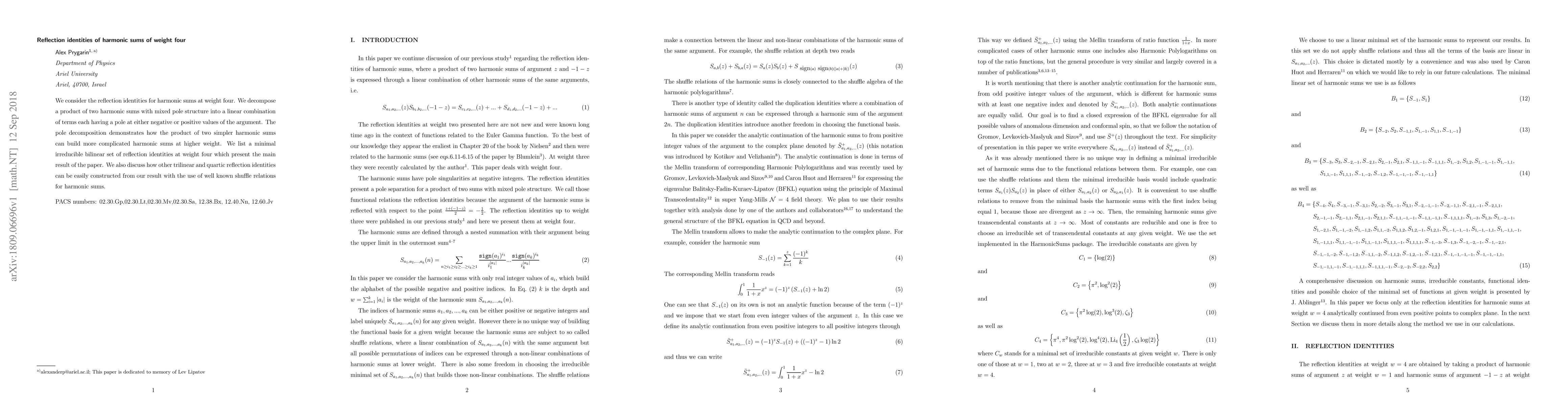 This paper explores reflection identities for harmonic sums of weight four, decomposing products of two harmonic sums into simpler pole structures. It presents a minimal set of irreducible bilinear identities and discusses constructing trilinear and quartic identities using shuffle relations.