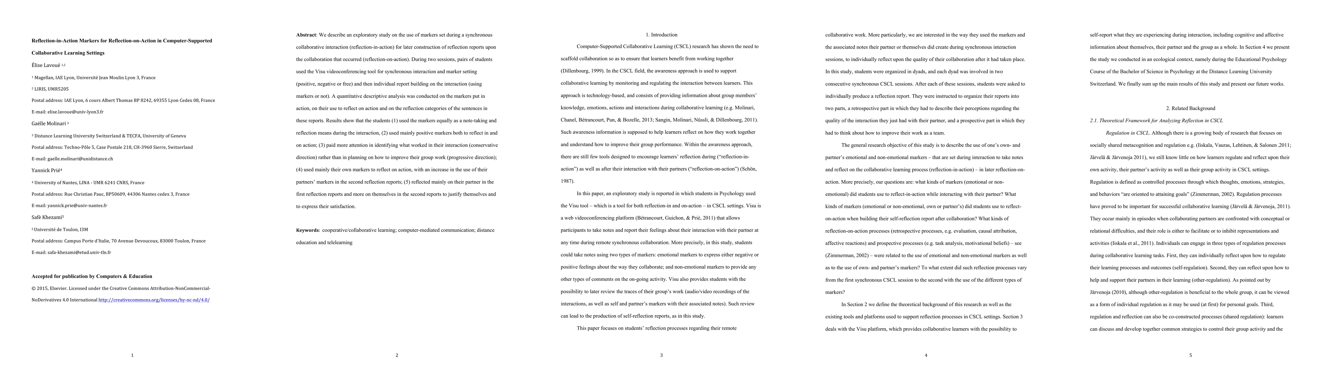 We describe an exploratory study on the use of markers set during a synchronous collaborative interaction (reflection-in-action) for later construction of reflection reports upon the collaboration that occurred (reflection-on-action). During two sessions, pairs of students used the Visu videoconferencing tool for synchronous interaction and marker setting (positive, negative or free) and then individual report building on the interaction (using markers or not). A quantitative descriptive analysis was conducted on the markers put in action, on their use to reflect on action and on the reflection categories of the sentences in these reports. Results show that the students (1) used the markers equally as a note-taking and reflection means during the interaction, (2) used mainly positive markers both to reflect in and on action; (3) paid more attention in identifying what worked in their interaction (conservative direction) rather than in planning on how to improve their group work (progressive direction); (4) used mainly their own markers to reflect on action, with an increase in the use of their partners's markers in the second reflection reports; (5) reflected mainly on their partner in the first reflection reports and more on themselves in the second reports to justify themselves and to express their satisfaction.
