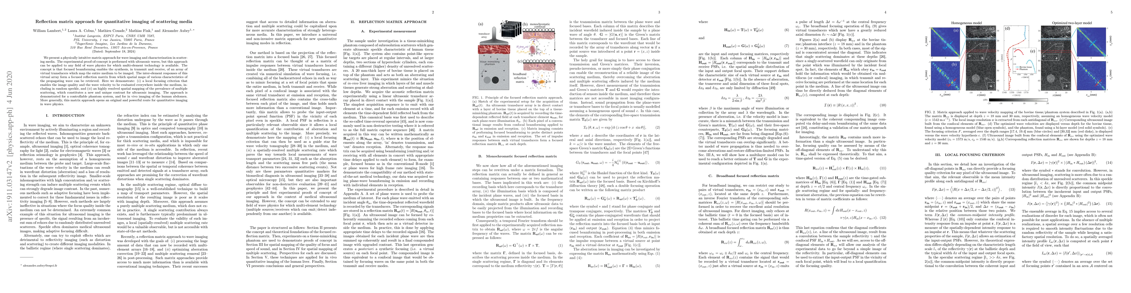 We present a physically intuitive matrix approach for wave imaging and characterization in scattering media. The experimental proof-of-concept is performed with ultrasonic waves, but this approach can be applied to any field of wave physics for which multi-element technology is available. The concept is that focused beamforming enables the synthesis, in transmit and receive, of an array of virtual transducers which map the entire medium to be imaged. The inter-element responses of this virtual array form a focused reflection matrix from which spatial maps of various characteristics of the propagating wave can be retrieved. Here we demonstrate: (i) a local focusing criterion that enables the image quality and the wave velocity to be evaluated everywhere inside the medium, including in random speckle, and (ii) an highly resolved spatial mapping of the prevalence of multiple scattering, which constitutes a new and unique contrast for ultrasonic imaging. The approach is demonstrated for a controllable phantom system, and for in vivo imaging of the human abdomen. More generally, this matrix approach opens an original and powerful route for quantitative imaging in wave physics.