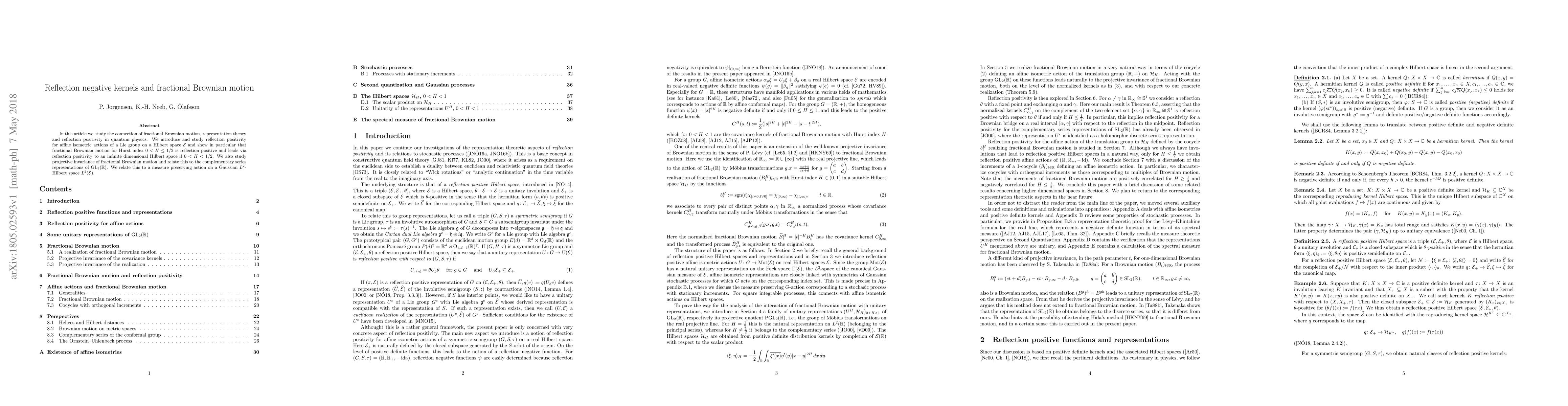 This paper explores the relationship between fractional Brownian motion, representation theory, and reflection positivity in quantum physics, demonstrating that fractional Brownian motion with a Hurst index between 0 and 1/2 is reflection positive and leads to an infinite-dimensional Hilbert space for indices less than 1/2. It also investigates the projective invariance of fractional Brownian motion and connects it to the complementary series representations of GL(2,R).