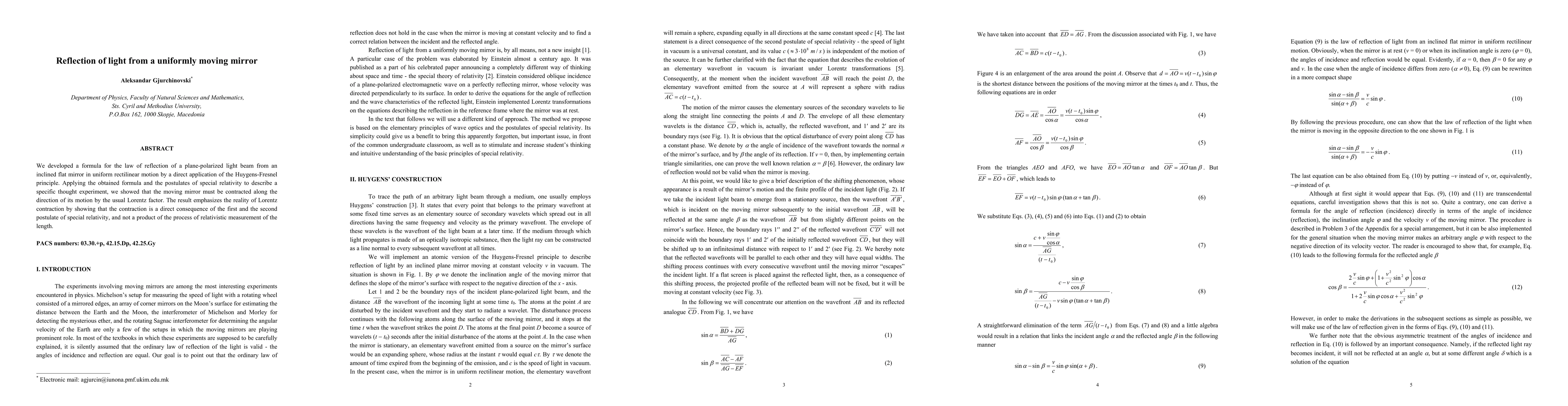 We developed a formula for the law of reflection of a plane-polarized light beam from an inclined flat mirror in uniform rectilinear motion by a direct application of the Huygens-Fresnel principle. Applying the obtained formula and the postulates of special relativity to describe a specific thought experiment, we showed that the moving mirror must be contracted along the direction of its motion by the usual Lorentz factor. The result emphasizes the reality of Lorentz contraction by showing that the contraction is a direct consequence of the first and second postulates of special relativity, and not a product of the process of relativistic measurement of the length.