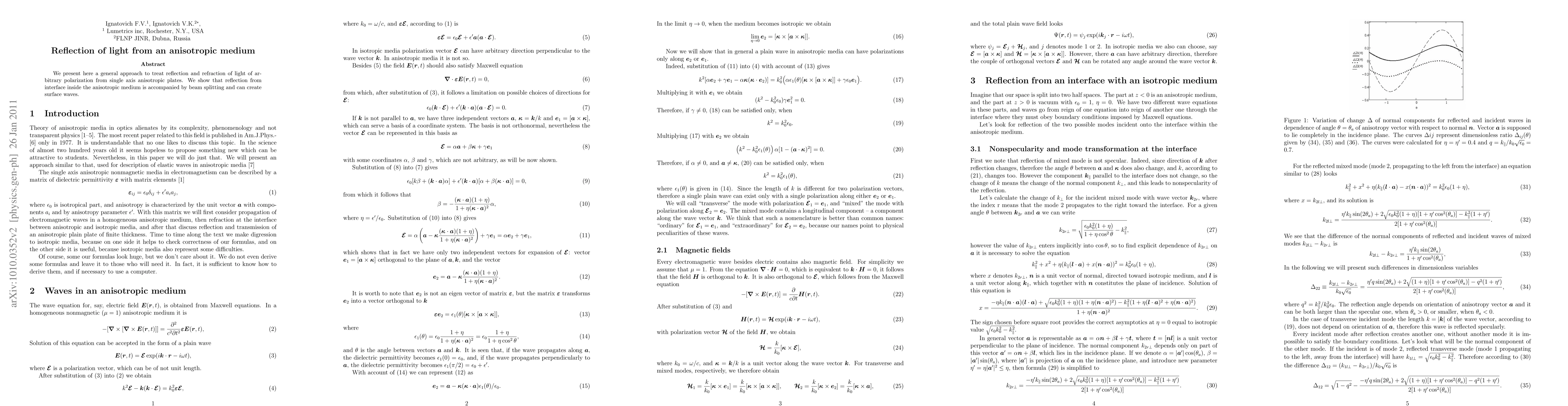 We present here a general approach to treat reflection and refraction of light of arbitrary polarization from single axis anisotropic plates. We show that reflection from interface inside the anisotropic medium is accompanied by beam splitting and can create surface waves.