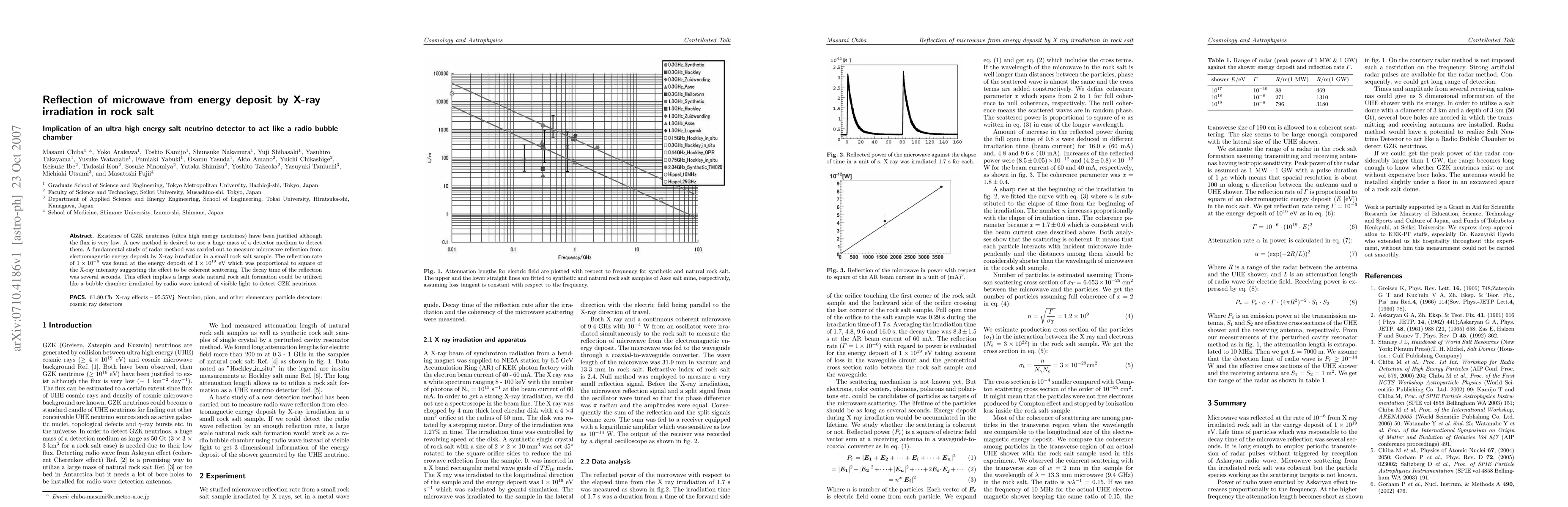 Existence of GZK neutrinos (ultra high energy neutrinos) have been justified although the flux is very low. A new method is desired to use a huge mass of a detector medium to detect them. A fundamental study of radar method was carried out to measure microwave reflection from electromagnetic energy deposit by X-ray irradiation in a small rock salt sample. The reflection rate of 1x10^-6 was found at the energy deposit of 1x10^19 eV which was proportional to square of the X-ray intensity suggesting the effect to be coherent scattering. The decay time of the reflection was several seconds. This effect implies a large scale natural rock salt formation could be utilized like a bubble chamber irradiated by radio wave instead of visible light to detect GZK neutrinos.