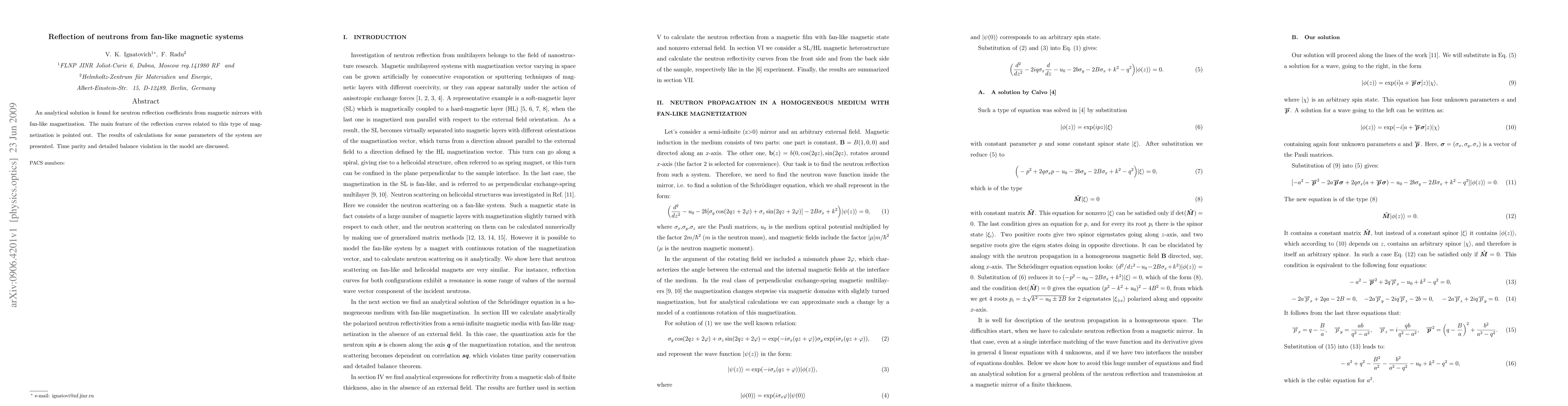 An analytical solution is found for neutron reflection coefficients from magnetic mirrors with fan-like magnetization. The main feature of the reflection curves related to this type of magnetization is pointed out. The results of calculations for some parameters of the system are presented. Time parity and detailed balance violation in the model are discussed.