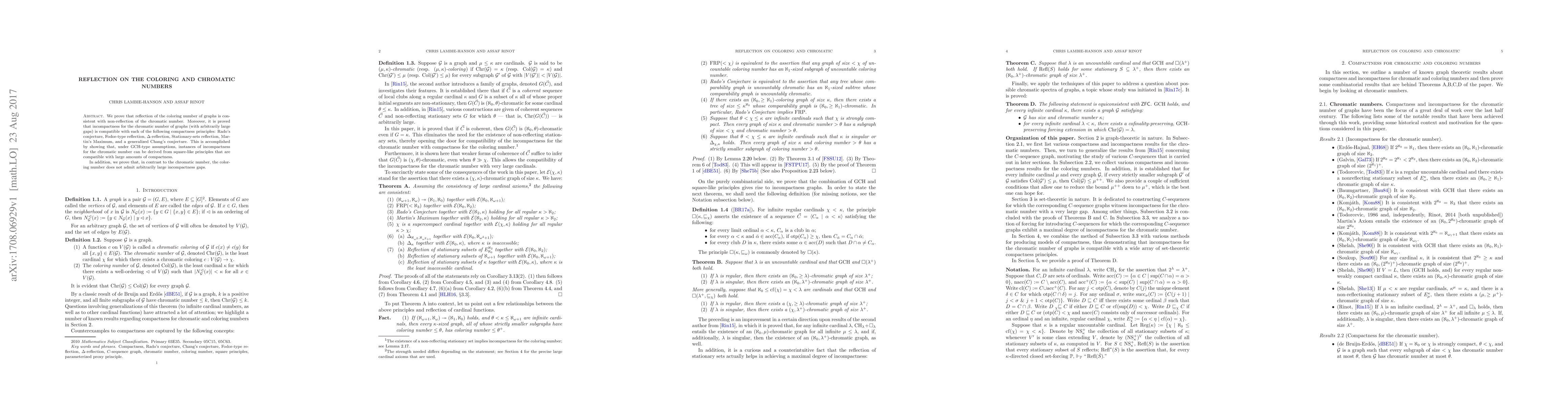 We prove that reflection of the coloring number of graphs is consistent with non-reflection of the chromatic number. Moreover, it is proved that incompactness for the chromatic number of graphs (with arbitrarily large gaps) is compatible with each of the following compactness principles: Rado's conjecture, Fodor-type reflection, $\Delta$-reflection, Stationary-sets reflection, Martin's Maximum, and a generalized Chang's conjecture. This is accomplished by showing that, under $\mathrm{GCH}$-type assumptions, instances of incompactness for the chromatic number can be derived from square-like principles that are compatible with large amounts of compactness. In addition, we prove that, in contrast to the chromatic number, the coloring number does not admit arbitrarily large incompactness gaps.