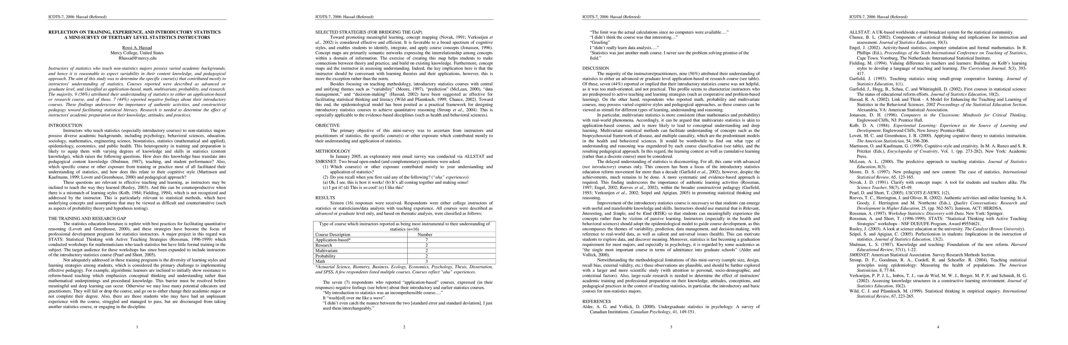 Instructors of statistics who teach non-statistics majors possess varied academic backgrounds, and hence it is reasonable to expect variability in their content knowledge, and pedagogical approach. The aim of this study was to determine the specific course(s) that contributed mostly to instructors' understanding of statistics. Courses reported were described as advanced or graduate level, and classified as application-based, math, multivariate, probability, and research. The majority, 9 (56%) attributed their understanding of statistics to either an application-based or research course, and of those, 7 (44%) reported negative feelings about their introductory courses. These findings underscore the importance of authentic activities, and constructivist pedagogy toward facilitating statistical literacy. Research is needed to determine the effect of instructors' academic preparation on their knowledge, attitudes, and practices.