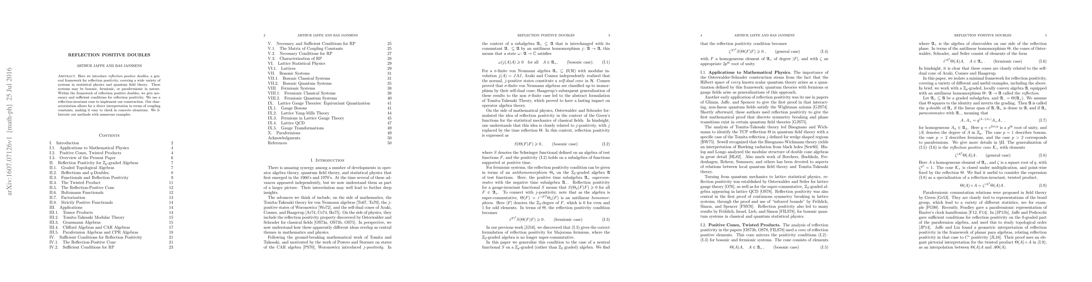 This paper introduces reflection positive doubles, a comprehensive framework for reflection positivity in statistical physics and quantum field theory, applicable to bosonic, fermionic, and parafermionic systems. It provides necessary and sufficient conditions for reflection positivity using a reflection-invariant cone, facilitating easy interpretation in terms of coupling constants and illustrated with numerous examples.