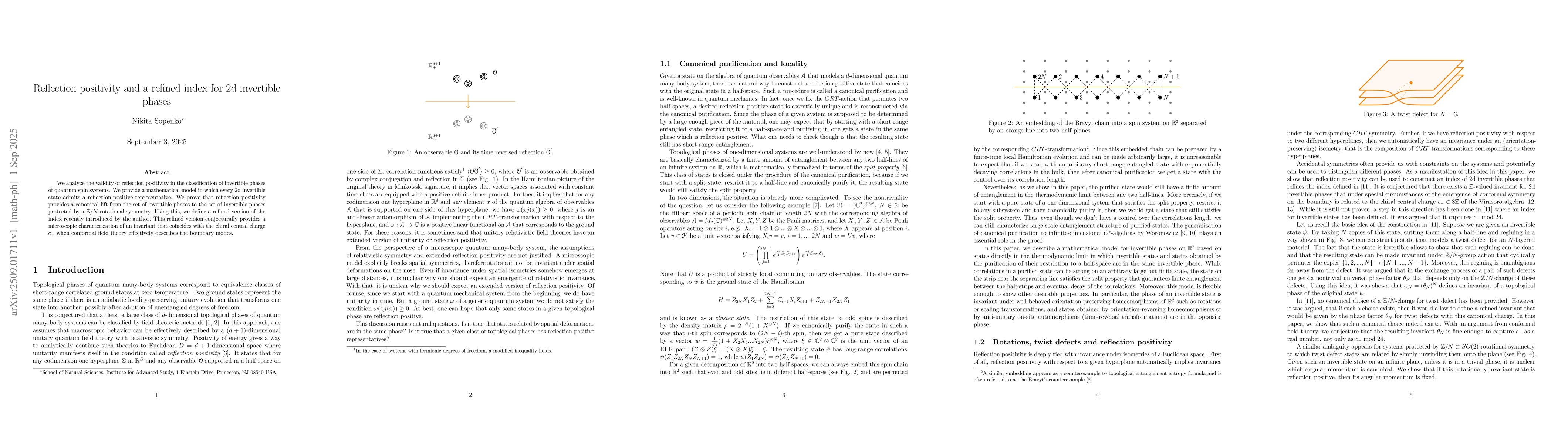 We analyze the validity of reflection positivity in the classification of invertible phases of quantum spin systems. We provide a mathematical model in which every 2d invertible state admits a reflection-positive representative. We prove that reflection positivity provides a canonical lift from the set of invertible phases to the set of invertible phases protected by a $\mathbb{Z}/N$-rotational symmetry. Using this, we define a refined version of the index recently introduced by the author. This refined version conjecturally provides a microscopic characterization of an invariant that coincides with the chiral central charge $c_-$ when conformal field theory effectively describes the boundary modes.