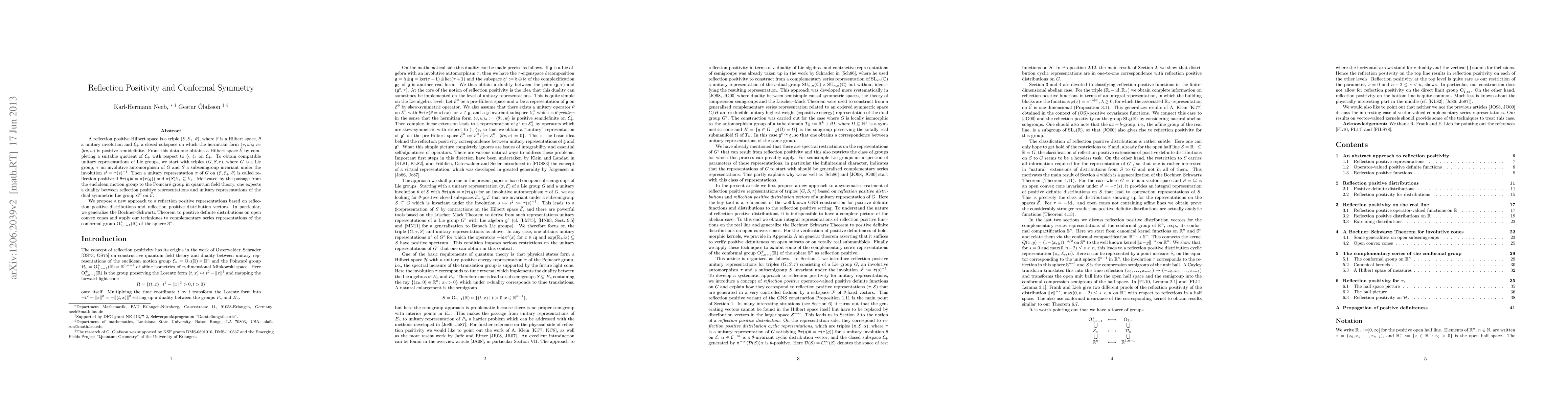 This paper explores reflection positivity, a concept originating from constructive quantum field theory, and its implementation on the level of unitary representations. It discusses reflection positivity in abstract terms using reflection positive distributions and applies these ideas to the conformal group, linking it to the sphere and half-space in physics.