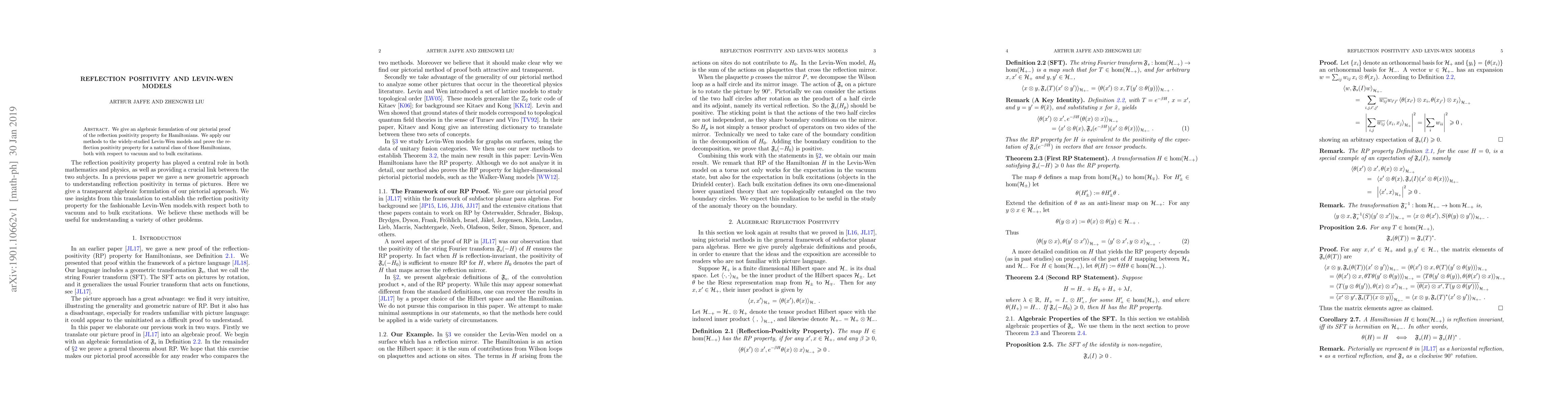The paper presents an algebraic formulation of a pictorial approach to reflection positivity, utilizing Levin-Wen models, and proves reflection positivity for these models with respect to vacuum and bulk excitations.