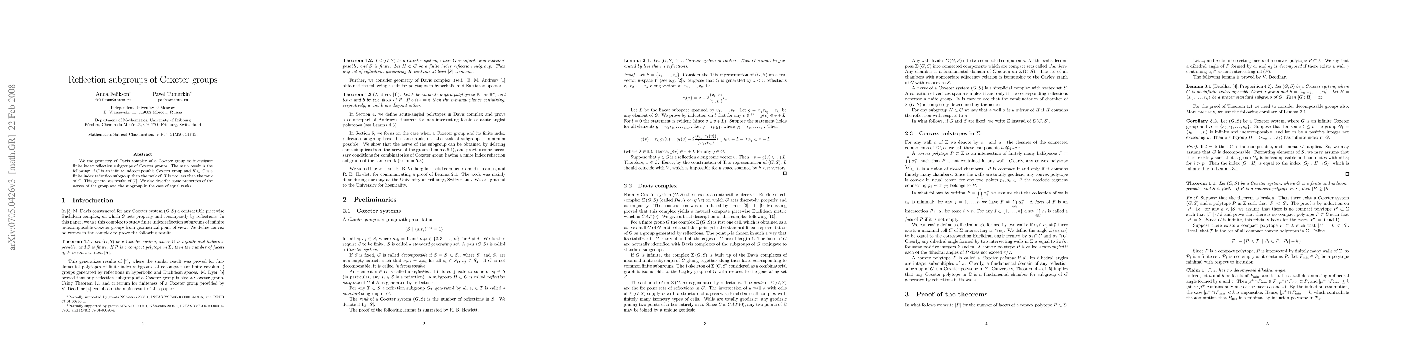 We use geometry of Davis complex of a Coxeter group to prove the following result: if G is an infinite indecomposable Coxeter group and $H\subset G$ is a finite index reflection subgroup then the rank of H is not less than the rank of G. This generalizes results of math/0305093. We also describe some properties of the nerves of the group and the subgroup in the case of equal ranks.