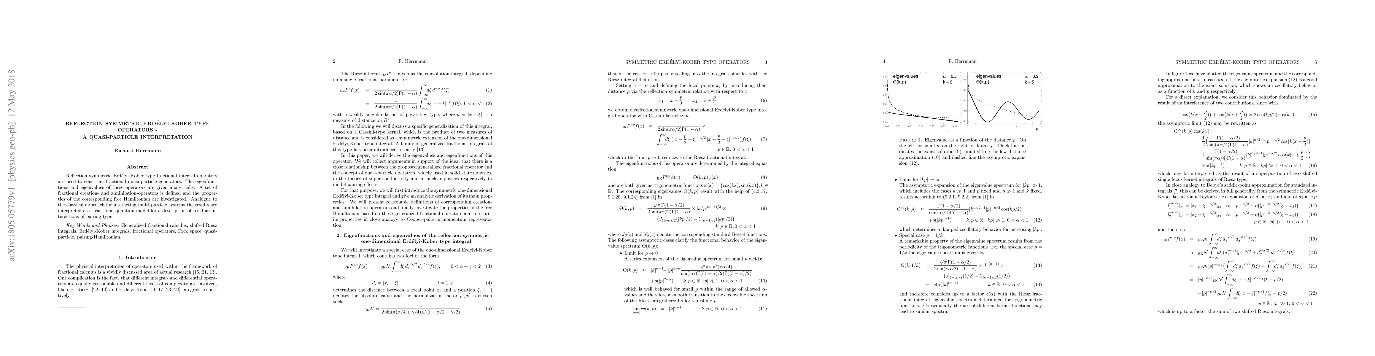 Reflection symmetric Erd$\acute{\text{e}}$lyi-Kober type fractional integral operators are used to construct fractional quasi-particle generators. The eigenfunctions and eigenvalues of these operators are given analytically. A set of fractional creation- and annihilation-operators is defined and the properties of the corresponding free Hamiltonian are investigated. Analogue to the classical approach for interacting multi-particle systems the results are interpreted as a fractional quantum model for a description of residual interactions of pairing type.