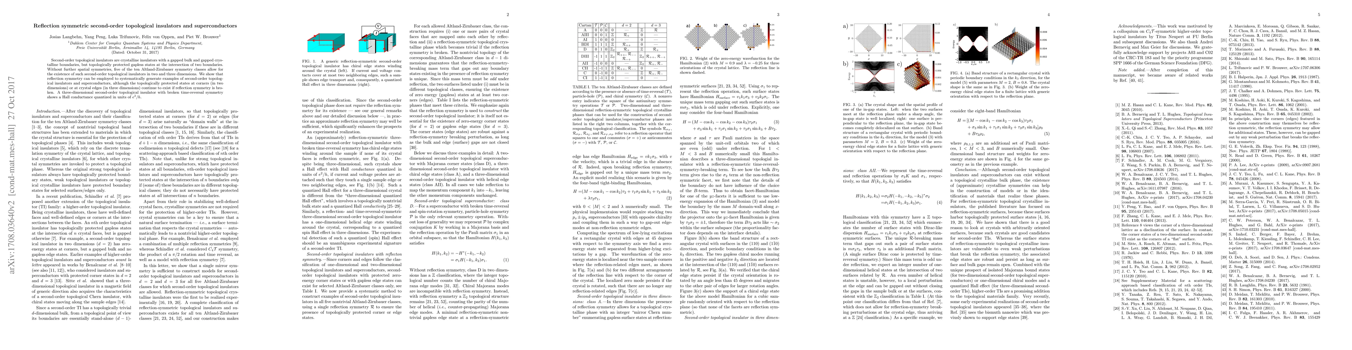 Summary: This paper explores reflection symmetric second-order topological insulators and superconductors, demonstrating how reflection symmetry can generate such materials while maintaining topologically protected gapless states at intersections of boundaries, even when reflection symmetry is broken. It also highlights a three-dimensional example with a quantized Hall conductance.