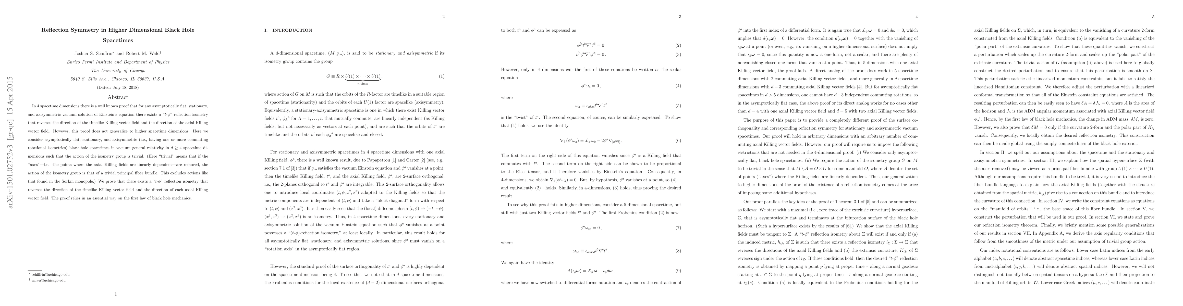 This research paper proves that in higher dimensional black hole spacetimes, a specific type of reflection symmetry exists, leveraging the first law of black hole mechanics to generalize a known result from 4 dimensions.