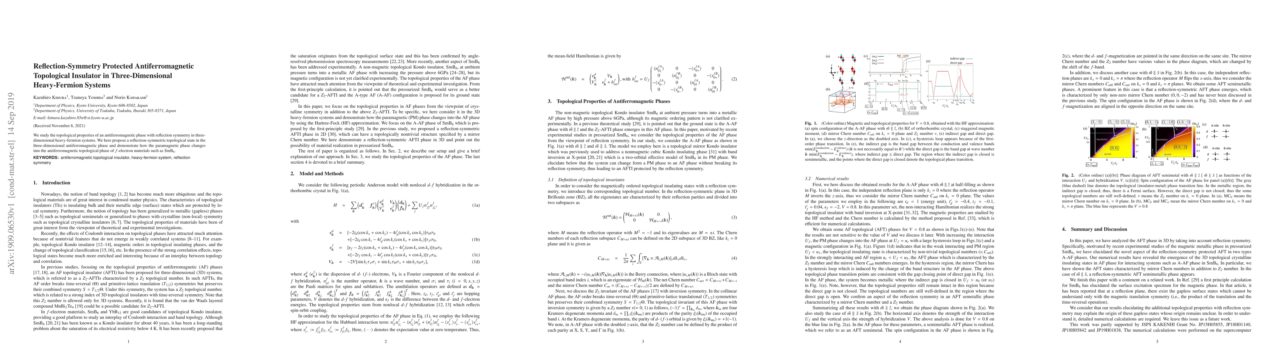 This paper investigates the topological properties of a reflection-symmetry protected antiferromagnetic phase in three-dimensional heavy-fermion systems, proposing a new reflection-symmetric topological state and demonstrating its emergence in f-electron materials like SmB6.