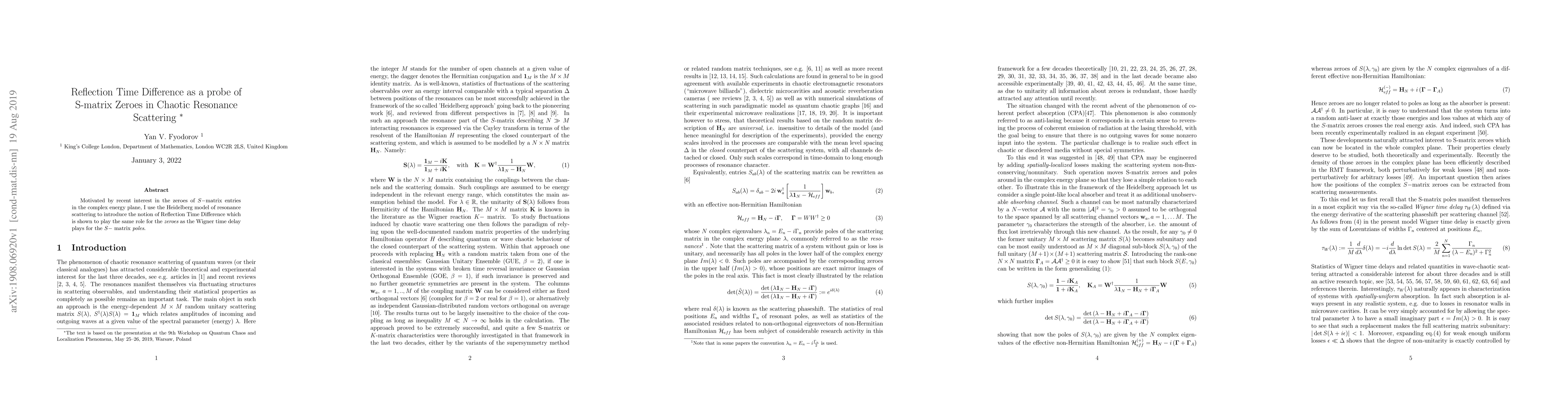 Summary: This paper explores the Reflection Time Difference as a method to identify zeroes of S-matrix entries in chaotic resonance scattering, analogous to the role of the Wigner time delay in identifying S-matrix poles, using the Heidelberg model.