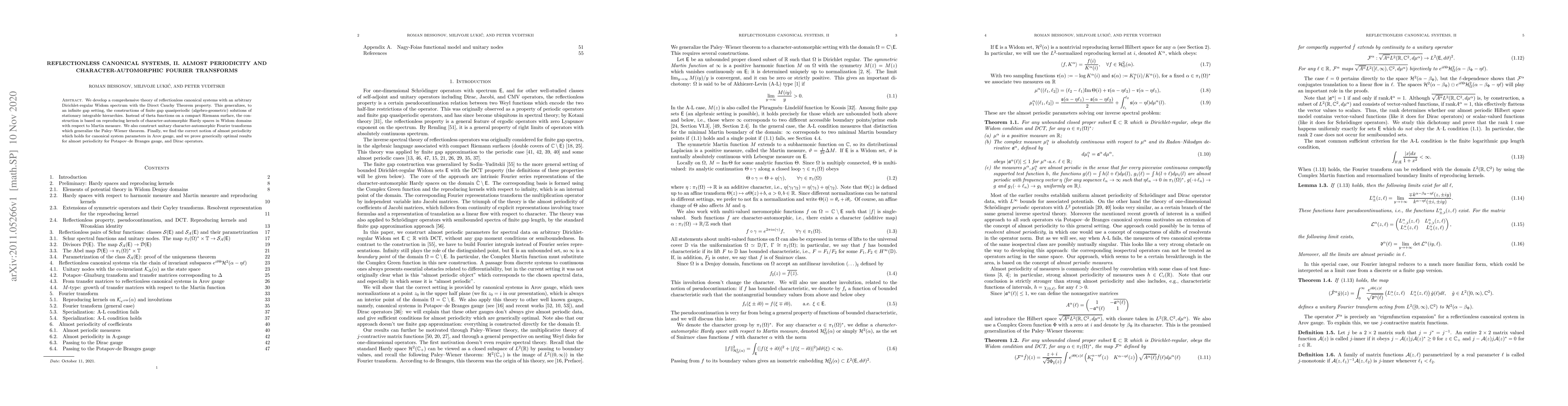 We develop a comprehensive theory of reflectionless canonical systems with an arbitrary Dirichlet-regular Widom spectrum with the Direct Cauchy Theorem property. This generalizes, to an infinite gap setting, the constructions of finite gap quasiperiodic (algebro-geometric) solutions of stationary integrable hierarchies. Instead of theta functions on a compact Riemann surface, the construction is based on reproducing kernels of character-automorphic Hardy spaces in Widom domains with respect to Martin measure. We also construct unitary character-automorphic Fourier transforms which generalize the Paley-Wiener theorem. Finally, we find the correct notion of almost periodicity which holds for canonical system parameters in Arov gauge, and we prove generically optimal results for almost periodicity for Potapov-de Branges gauge, and Dirac operators.