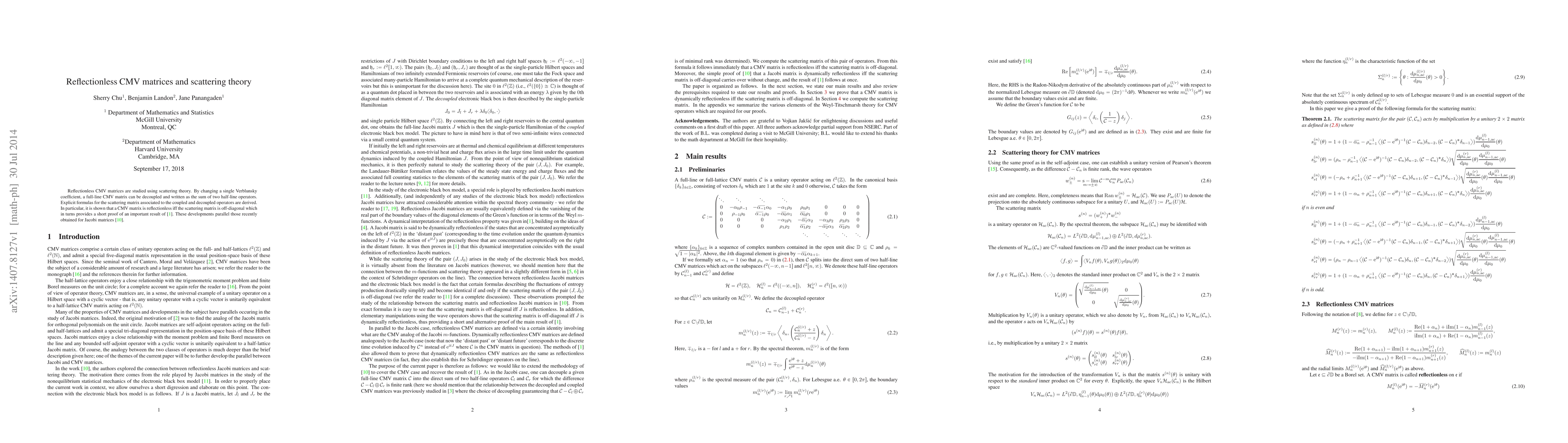 This paper explores reflectionless CMV matrices through scattering theory, demonstrating that a single Verblunsky coefficient change can decouple a full-line CMV matrix into two half-line operators. It derives explicit formulas for the scattering matrix and proves that a CMV matrix is reflectionless if its scattering matrix is off-diagonal.