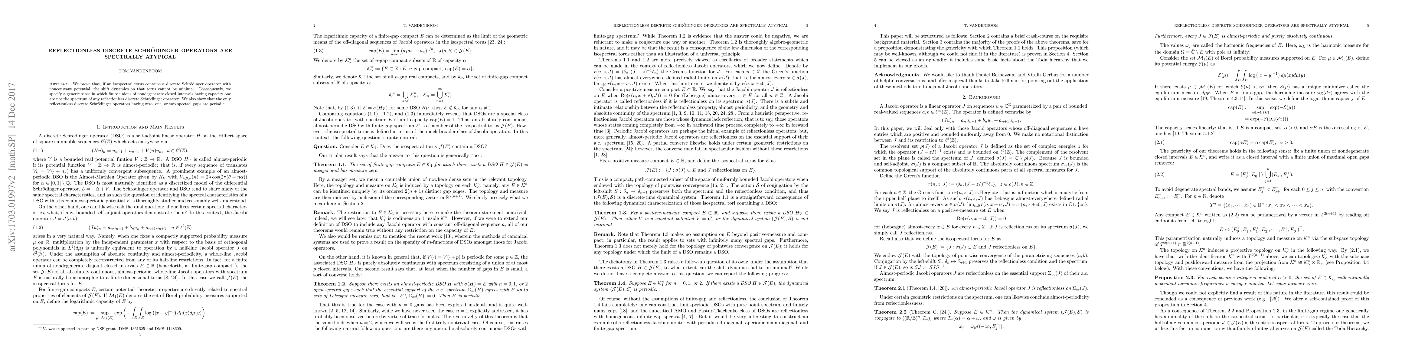 This paper demonstrates that nonconstant potentials in discrete Schrödinger operators lead to non-minimal shift dynamics on isospectral tori, and establishes that finite unions of nondegenerate closed intervals with capacity one cannot constitute the spectrum of reflectionless operators. It also concludes that reflectionless operators with zero, one, or two spectral gaps must be periodic.