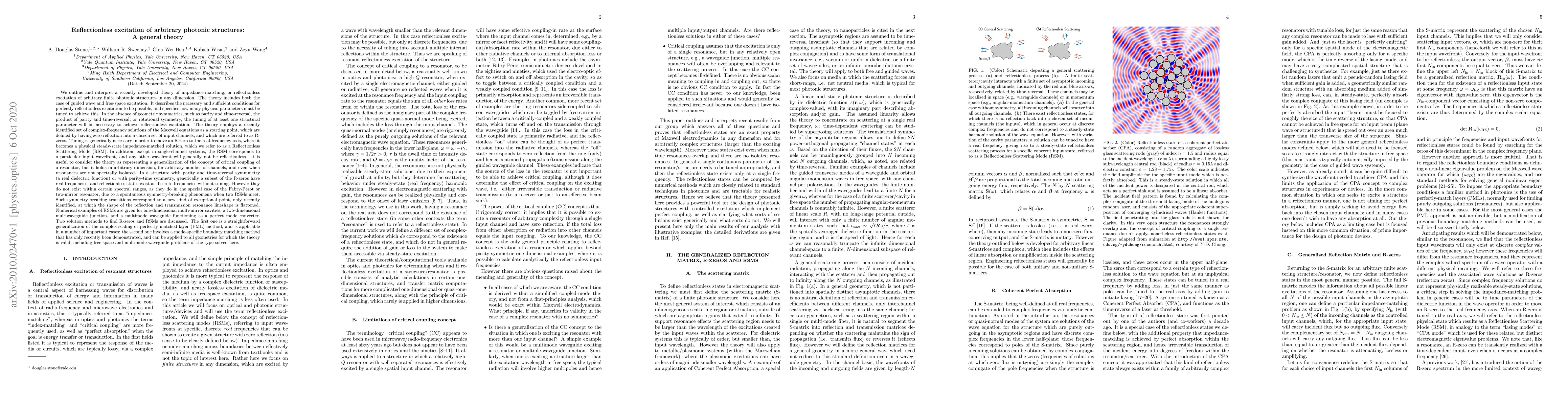 We outline a recently developed theory of impedance-matching, or reflectionless excitation of arbitrary finite photonic structures in any dimension. It describes the necessary and sufficient conditions for perfectly reflectionless excitation to be possible, and specifies how many physical parameters must be tuned to achieve this. In the absence of geometric symmetries the tuning of at least one structural parameter will be necessary to achieve reflectionless excitation. The theory employs a recently identified set of complex-frequency solutions of the Maxwell equations as a starting point, which are defined by having zero reflection into a chosen set of input channels, and which are referred to as R-zeros. Tuning is generically necessary in order to move an R-zero to the real-frequency axis, where it becomes a physical steady-state solution, referred to as a Reflectionless Scattering Mode (RSM). Except in single-channel systems, the RSM corresponds to a particular input wavefront, and any other wavefront will generally not be reflectionless. In a structure with parity and time-reversal symmmetry or with parity-time symmetry, generically a subset of R-zeros is real, and reflectionless states exist without structural tuning. Such systems can exhibit symmetry-breaking transitions when two RSMs meet, which corresponds to a recently identified kind of exceptional point at which the shape of the reflection and transmission resonance lineshape is flattened.