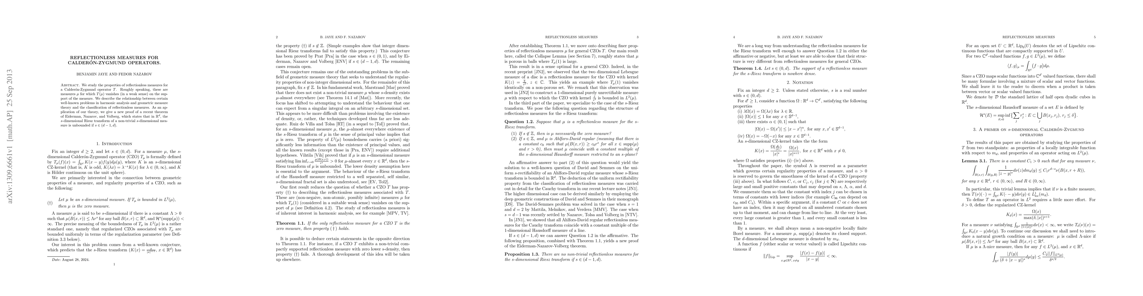 We study the properties of reflectionless measures for a Calder\'{o}n-Zygmund operator T. Roughly speaking, these are measures $\mu$ for which T(\mu) vanishes (in a weak sense) on the support of the measure. We describe the relationship between certain well-known problems in harmonic analysis and geometric measure theory and the classification of reflectionless measures. As an application of our theory, we give a new proof of a recent theorem of Eiderman, Nazarov, and Volberg, which states that in $\mathbb{R}^d$, the s-dimensional Riesz transform of a non-trivial $s$-dimensional measure is unbounded if $s\in (d-1,d)$.