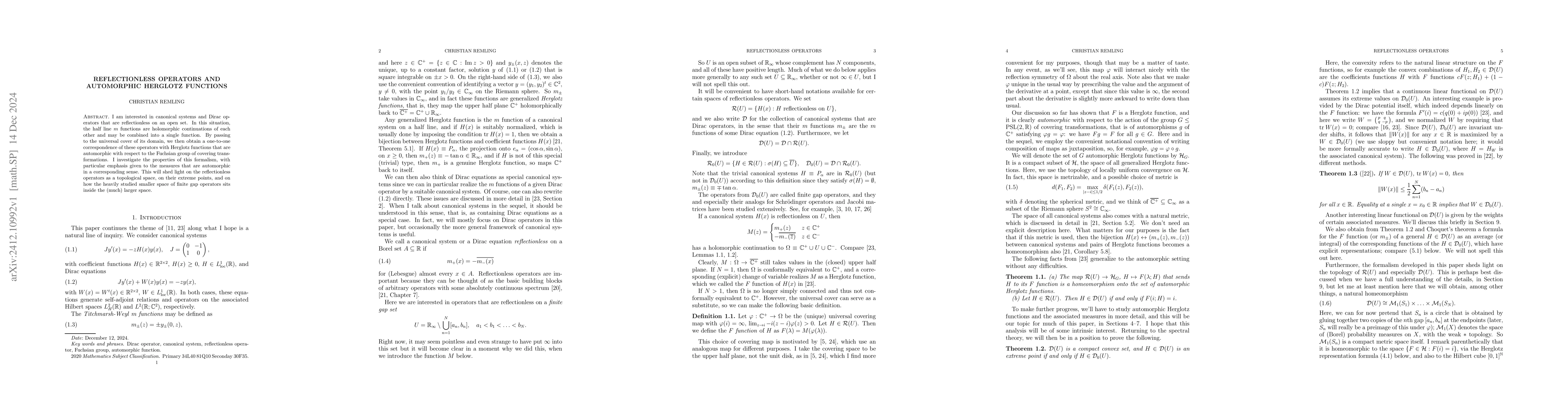 The research employs a detailed analysis of reflectionless operators and their relationship with automorphic Herglotz functions, utilizing canonical systems and Dirac operators, and establishing a one-to-one correspondence with Herglotz functions that are automorphic under Fuchsian group covering transformations.