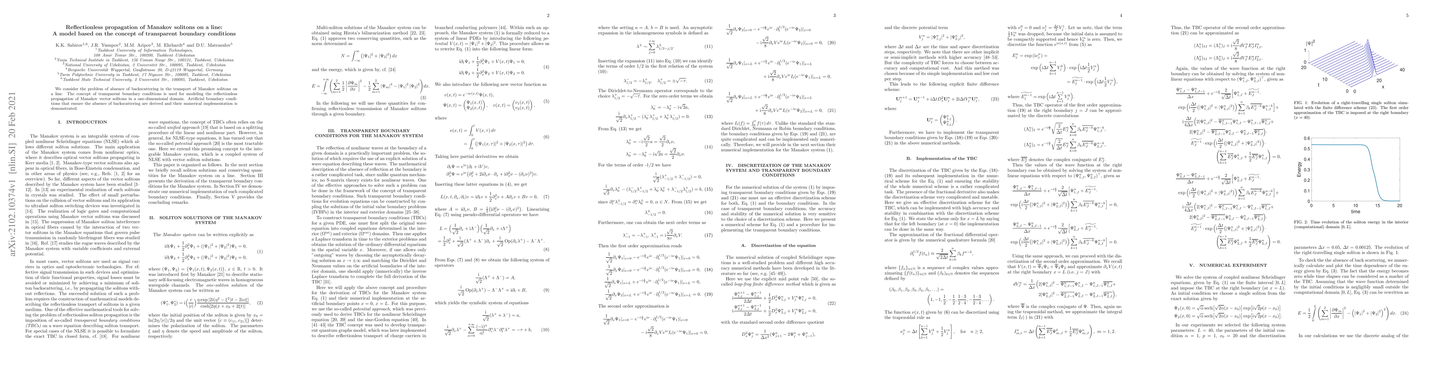 This paper investigates the reflectionless propagation of Manakov solitons on a line using transparent boundary conditions to model the absence of backscattering. It derives artificial boundary conditions that ensure the numerical implementation of this reflectionless transport.