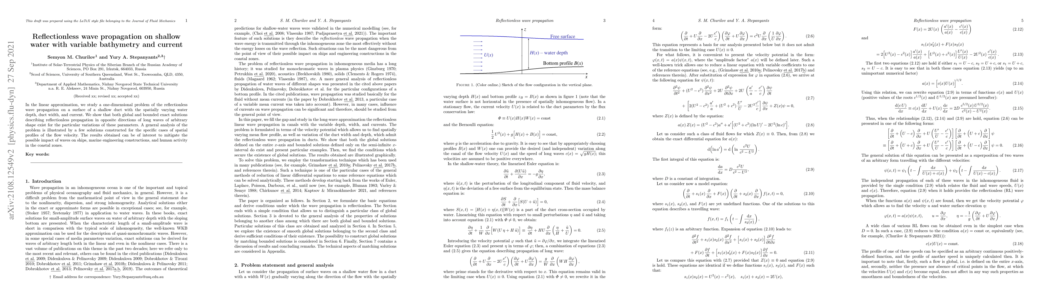 This paper investigates reflectionless wave propagation in shallow water under varying bathymetry and current, demonstrating the existence of exact solutions for long waves of arbitrary shapes. The findings may aid in mitigating wave impacts on ships and coastal structures.