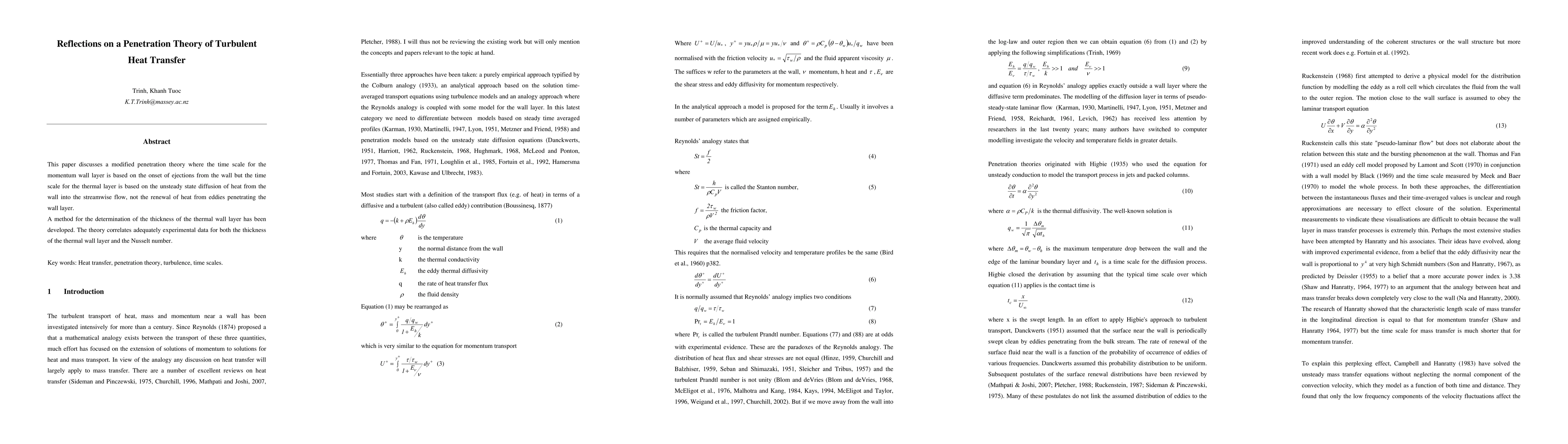This paper discusses a modified penetration theory where the time scale for the momentum wall layer is based on the onset of ejections from the wall but the time scale for the thermal layer is based on the unsteady state diffusion of heat from the wall into the streamwise flow, not the renewal of heat from eddies penetrating the wall layer. A method for the determination of the thickness of the thermal wall layer has been developed. The theory correlates adequately experimental data for both the thickness of the thermal wall layer and the Nusselt number. Key words: Heat transfer, penetration theory, turbulence, time scales.