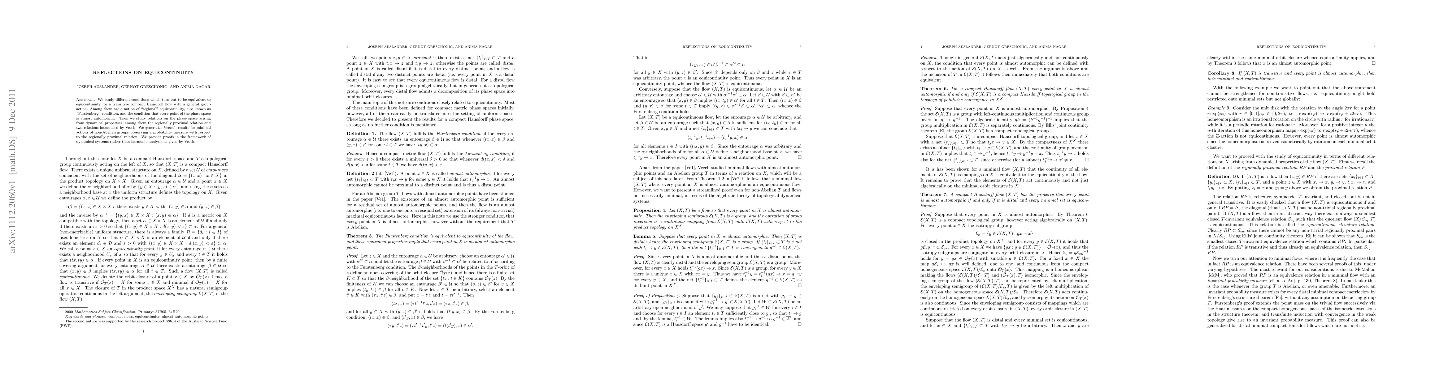We study different conditions which turn out to be equivalent to equicontinuity for a transitive compact Hausdorff flow with a general group action. Among them are a notion of "regional" equicontinuity, also known as "Furstenberg" condition, and the condition that every point of the phase space is almost automorphic. Then we study relations on the phase space arising from dynamical properties, among them the regionally proximal relation and two relations introduced by Veech. We generalize Veech's results for minimal actions of non-Abelian groups preserving a probability measure with respect to the regionally proximal relation. We provide proofs in the framework of dynamical systems rather than harmonic analysis as given by Veech.