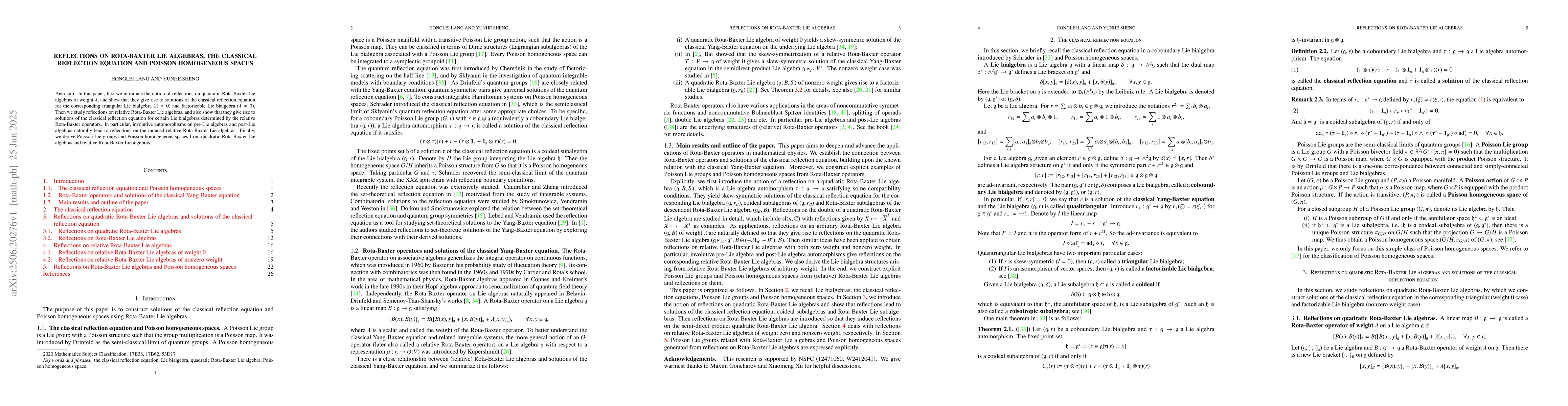 In this paper, first we introduce the notion of reflections on quadratic Rota-Baxter Lie algebras of weight $\lambda$, and show that they give rise to solutions of the classical reflection equation for the corresponding triangular Lie bialgebra ($\lambda=0$) and factorizable Lie bialgebra ($\lambda\neq0$). Then we study reflections on relative Rota-Baxter Lie algebras, and also show that they give rise to solutions of the classical reflection equation for certain Lie bialgebras determined by the relative Rota-Baxter operators. In particular, involutive automorphisms on pre-Lie algebras and post-Lie algebras naturally lead to reflections on the induced relative Rota-Baxter Lie algebras. Finally, we derive Poisson Lie groups and Poisson homogeneous spaces from quadratic Rota-Baxter Lie algebras and relative Rota-Baxter Lie algebras.