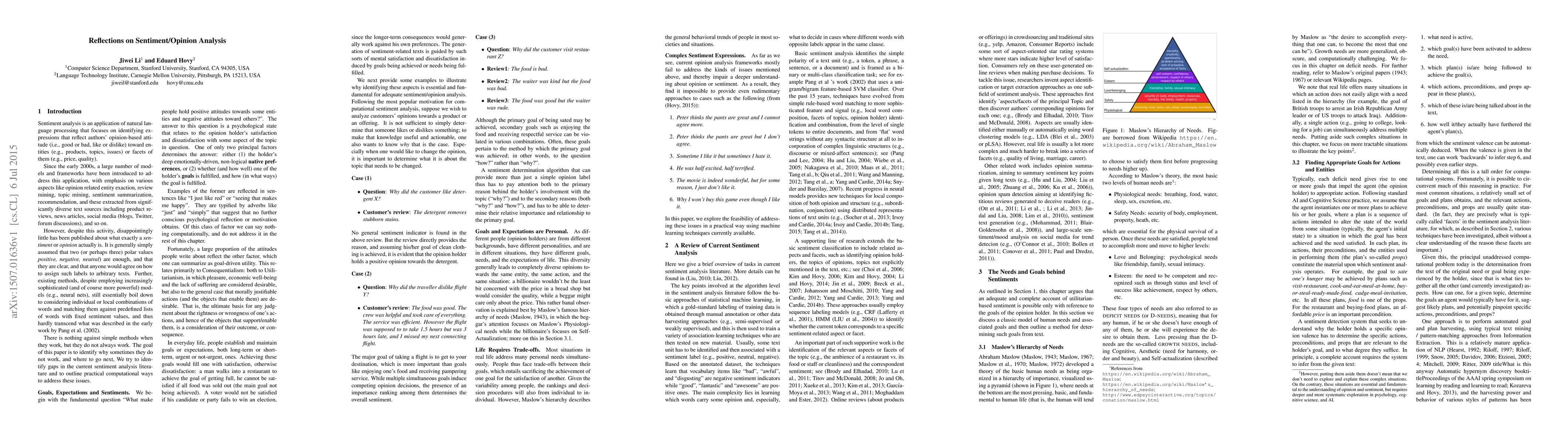 In this paper, we described possible directions for deeper understanding, helping bridge the gap between psychology / cognitive science and computational approaches in sentiment/opinion analysis literature. We focus on the opinion holder's underlying needs and their resultant goals, which, in a utilitarian model of sentiment, provides the basis for explaining the reason a sentiment valence is held. While these thoughts are still immature, scattered, unstructured, and even imaginary, we believe that these perspectives might suggest fruitful avenues for various kinds of future work.