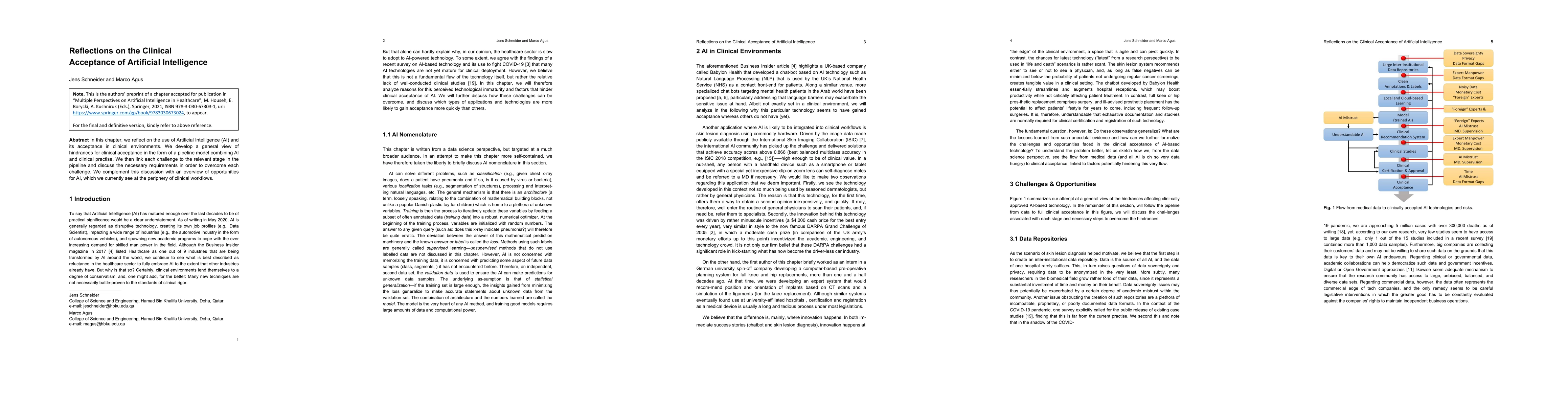 In this chapter, we reflect on the use of Artificial Intelligence (AI) and its acceptance in clinical environments. We develop a general view of hindrances for clinical acceptance in the form of a pipeline model combining AI and clinical practise. We then link each challenge to the relevant stage in the pipeline and discuss the necessary requirements in order to overcome each challenge. We complement this discussion with an overview of opportunities for AI, which we currently see at the periphery of clinical workflows.