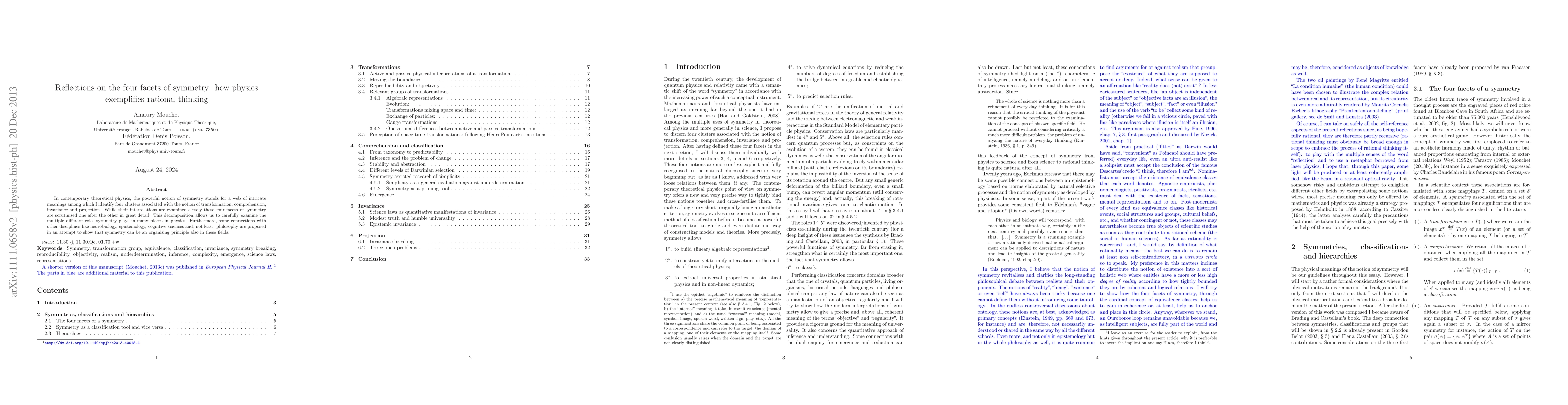 In contemporary theoretical physics, the powerful notion of symmetry stands for a web of intricate meanings among which I identify four clusters associated with the notion of transformation, comprehension, invariance and projection. While their interrelations are examined closely, these four facets of symmetry are scrutinised one after the other in great detail. This decomposition allows us to examine closely the multiple different roles symmetry plays in many places in physics. Furthermore, some connections with others disciplines like neurobiology, epistemology, cognitive sciences and, not least, philosophy are proposed in an attempt to show that symmetry can be an organising principle also in these fields.