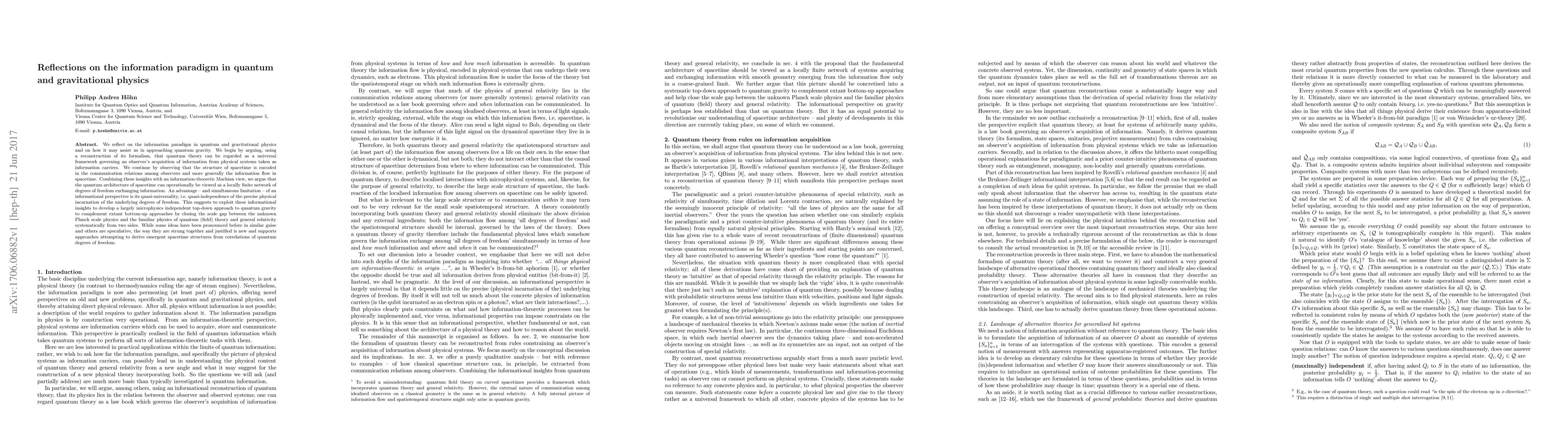 We reflect on the information paradigm in quantum and gravitational physics and on how it may assist us in approaching quantum gravity. We begin by arguing, using a reconstruction of its formalism, that quantum theory can be regarded as a universal framework governing an observer's acquisition of information from physical systems taken as information carriers. We continue by observing that the structure of spacetime is encoded in the communication relations among observers and more generally the information flow in spacetime. Combining these insights with an information-theoretic Machian view, we argue that the quantum architecture of spacetime can operationally be viewed as a locally finite network of degrees of freedom exchanging information. An advantage -- and simultaneous limitation -- of an informational perspective is its quasi-universality, i.e. quasi-independence of the precise physical incarnation of the underlying degrees of freedom. This suggests to exploit these informational insights to develop a largely microphysics independent top-down approach to quantum gravity to complement extant bottom-up approaches by closing the scale gap between the unknown Planck scale physics and the familiar physics of quantum (field) theory and general relativity systematically from two sides. While some ideas have been pronounced before in similar guise and others are speculative, the way they are strung together and justified is new and supports approaches attempting to derive emergent spacetime structures from correlations of quantum degrees of freedom.