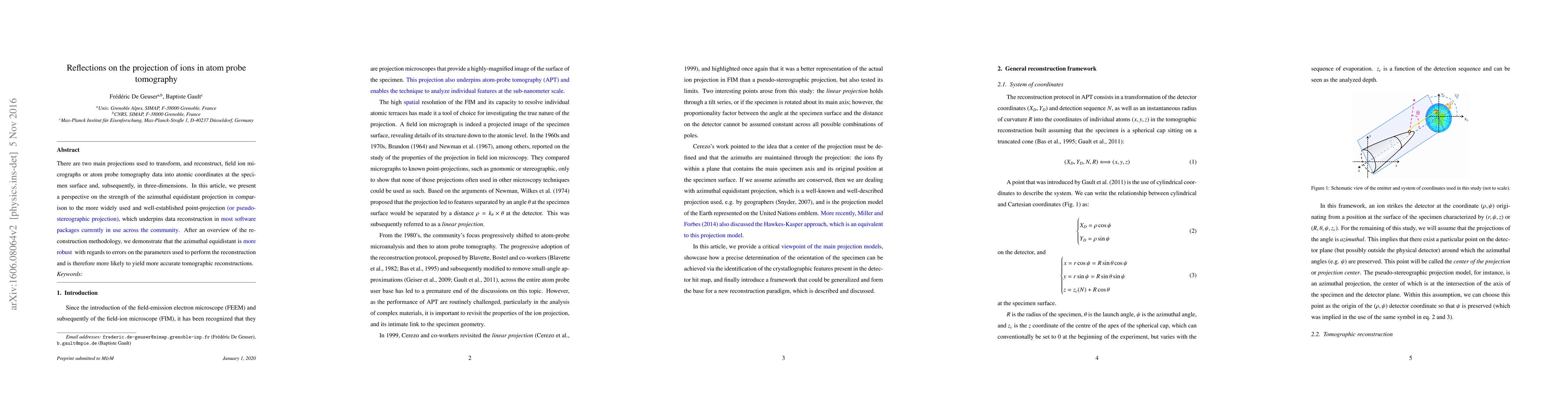 There are two main projections used to transform, and reconstruct, field ion micrographs or atom probe tomography data into atomic coordinates at the specimen surface and, subsequently, in three-dimensions. In this article, we present a perspective on the strength of the azimuthal equidistant projection in comparison to the more widely used and well-established point-projection(or pseudo-stereographic projection), which underpins data reconstruction in most software packages currently in use across the community. After an overview of the reconstruction methodology, we demonstrate that the azimuthal equidistant is more robust with regards to errors on the parameters used to perform the reconstruction and is therefore more likely to yield more accurate tomographic reconstructions.