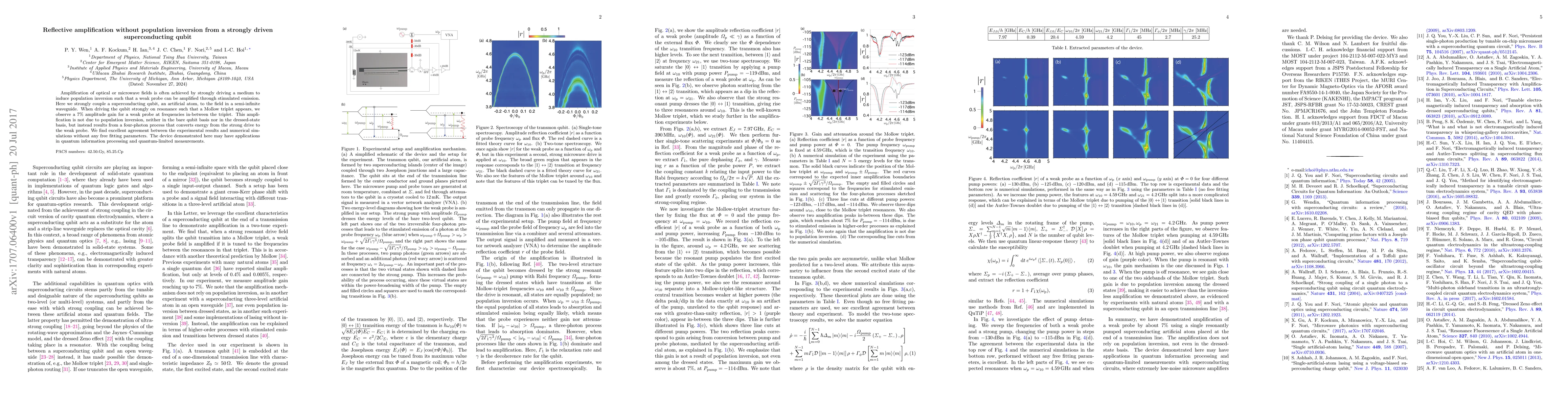 This paper reports on the amplification of microwave fields using a strongly driven superconducting qubit without population inversion, observing a 7% gain through a four-photon process. Experimental results match numerical simulations, suggesting potential applications in quantum information processing.