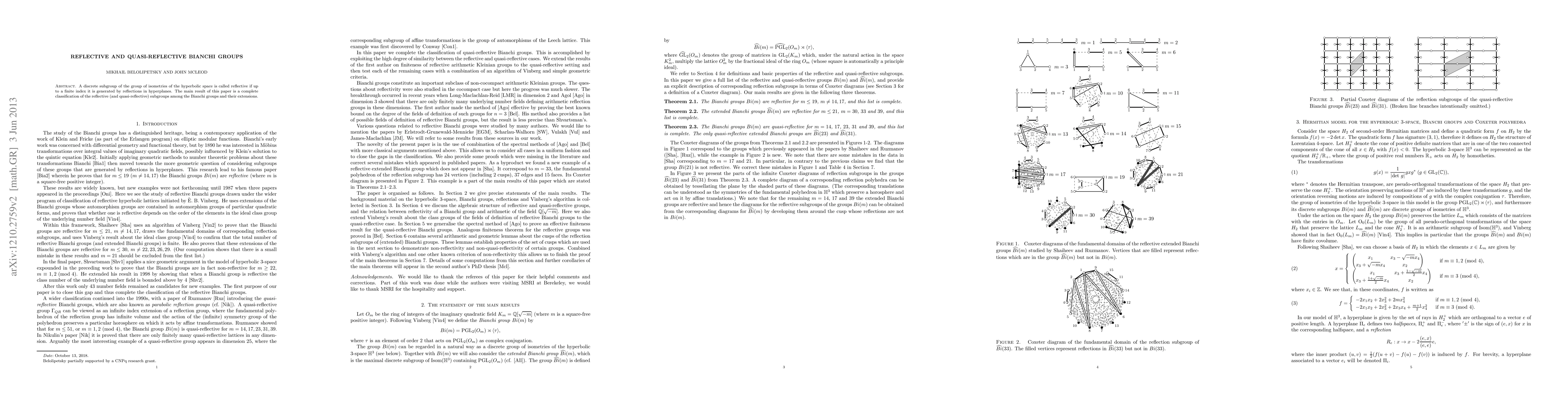 This paper classifies reflective and quasi-reflective subgroups of Bianchi groups as extensions of specific hyperbolic groups, providing a complete understanding of these discrete subgroup types.