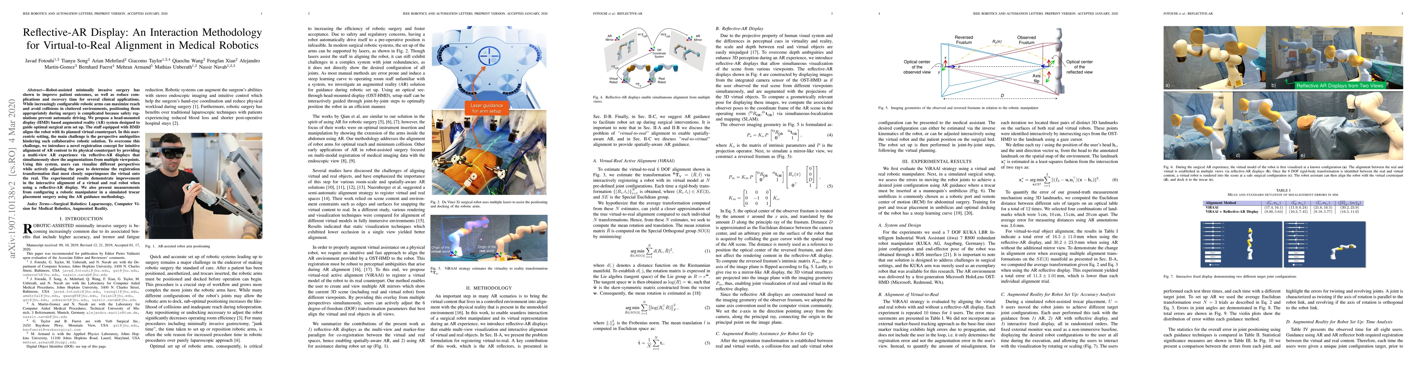 This paper proposes a head-mounted AR system with reflective displays to enhance the alignment of virtual and real robotic arms in medical surgeries, addressing perspective ambiguities through multi-view visualization. Experimental results show improved interactive alignment and successful application in simulated trocar placement surgery.