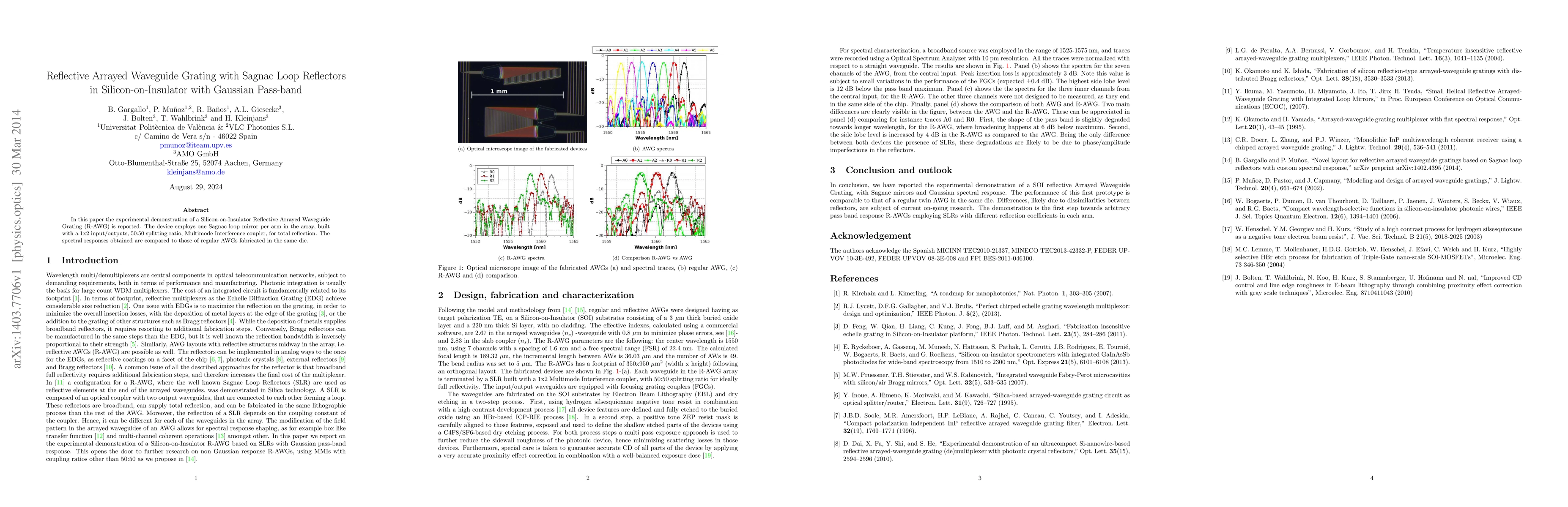 This paper demonstrates a Silicon-on-Insulator Reflective Arrayed Waveguide Grating (R-AWG) using Sagnac loop reflectors, achieving a Gaussian pass-band. The device's spectral responses are compared to those of conventional AWGs in the same die.