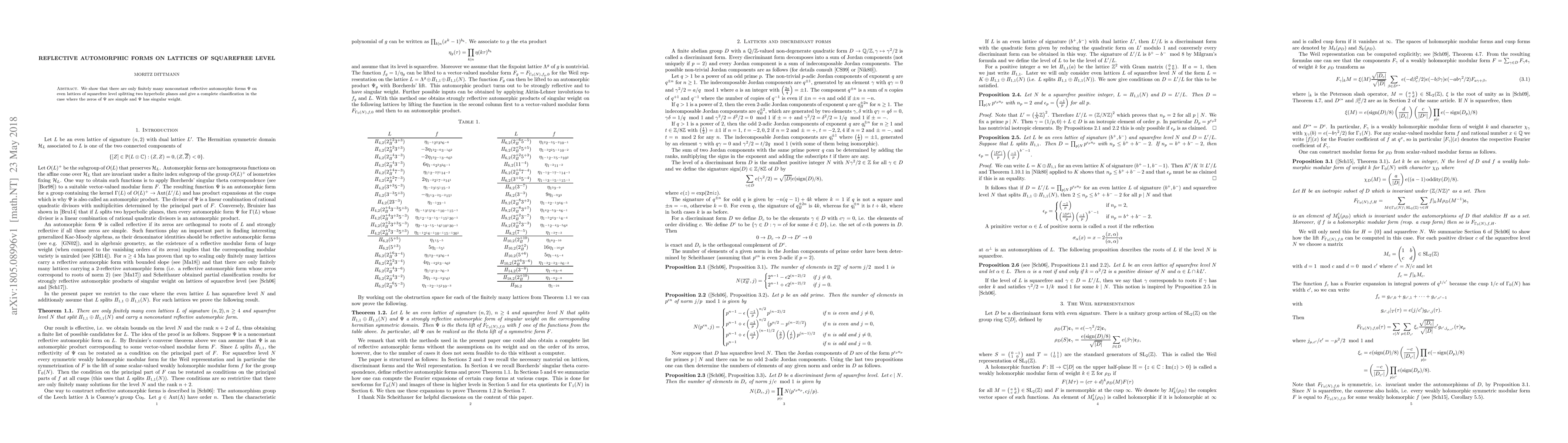 This paper demonstrates that there are only a finite number of nonconstant reflective automorphic forms on even lattices with squarefree levels that split two hyperbolic planes, providing a complete classification for those with simple zeros and singular weight.