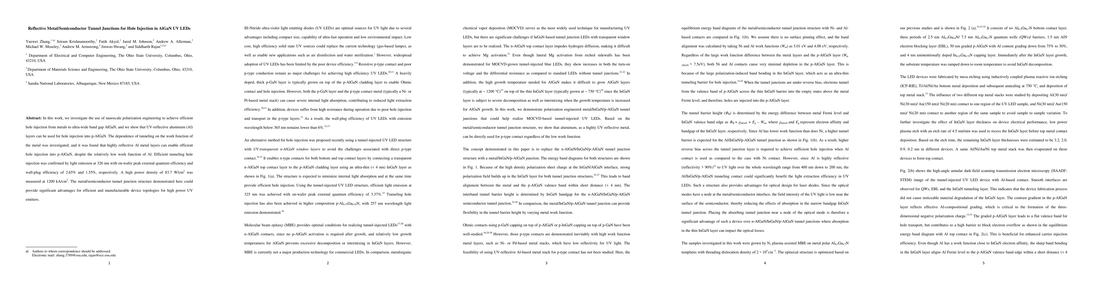 This research explores nanoscale polarization engineering for efficient hole injection in AlGaN UV LEDs using reflective aluminum layers, achieving high power density and quantum efficiency through metal/semiconductor tunnel junctions. The study confirms that despite Al's low work function, reflective Al layers can enable effective hole injection, leading to significant improvements in UV LED performance.