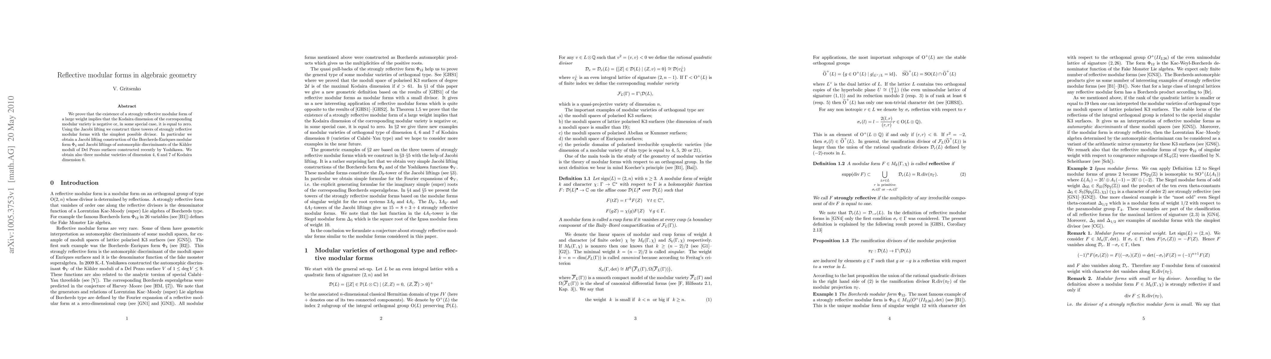 This paper proves that the existence of strongly reflective modular forms of large weight leads to negative or zero Kodaira dimension for corresponding modular varieties. It constructs three towers of such forms using Jacobi lifting, including the Borcherds-Enriques form and automorphic discriminants of Del Pezzo surfaces, and identifies three modular varieties of dimensions 4, 6, and 7 with Kodaira dimension 0.
