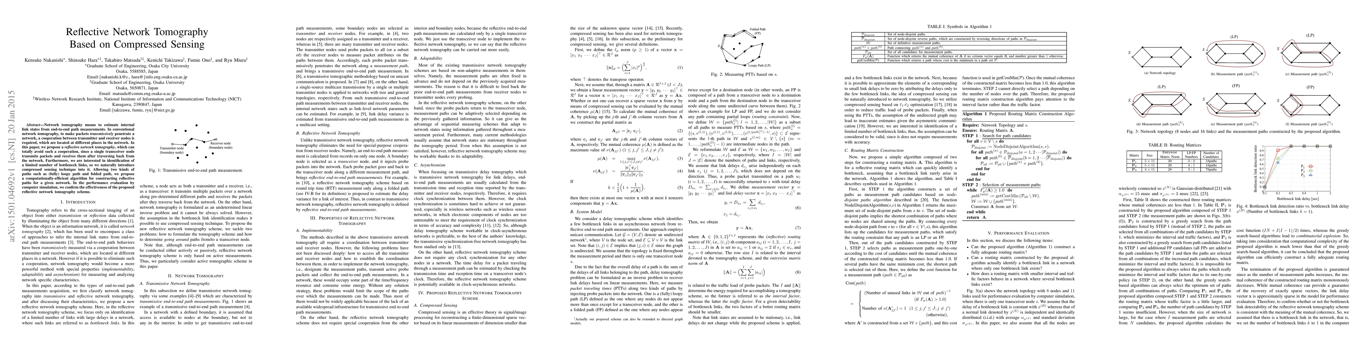 This paper proposes a reflective network tomography method that eliminates the need for cooperation between transmitter and receiver nodes by using a single transceiver node. It integrates compressed sensing to identify bottleneck links efficiently and introduces a computationally-efficient algorithm for constructing reflective paths, demonstrating effectiveness through computer simulations.