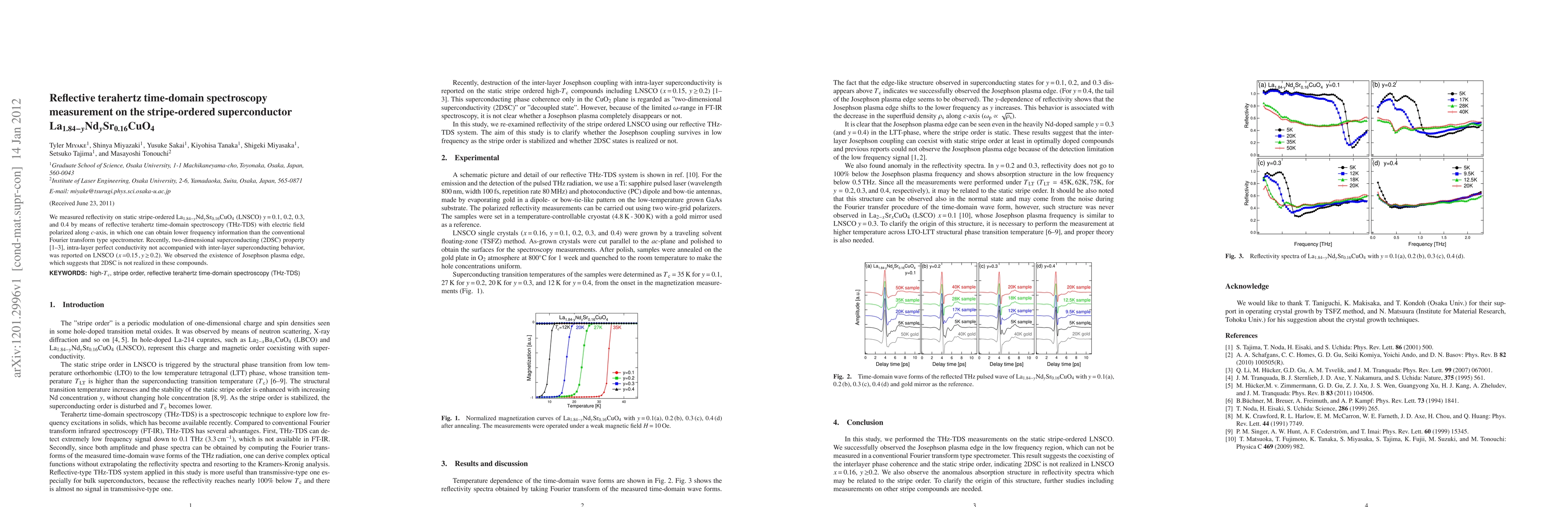 The research utilizes reflective terahertz time-domain spectroscopy (THz-TDS) to analyze stripe-ordered superconductor La1.84-yNdySr0.16CuO4. The study finds evidence against the two-dimensional superconducting property previously reported for higher y values, suggesting intralayer superconductivity without interlayer conductivity, contradicting the Josephson plasma edge observation.