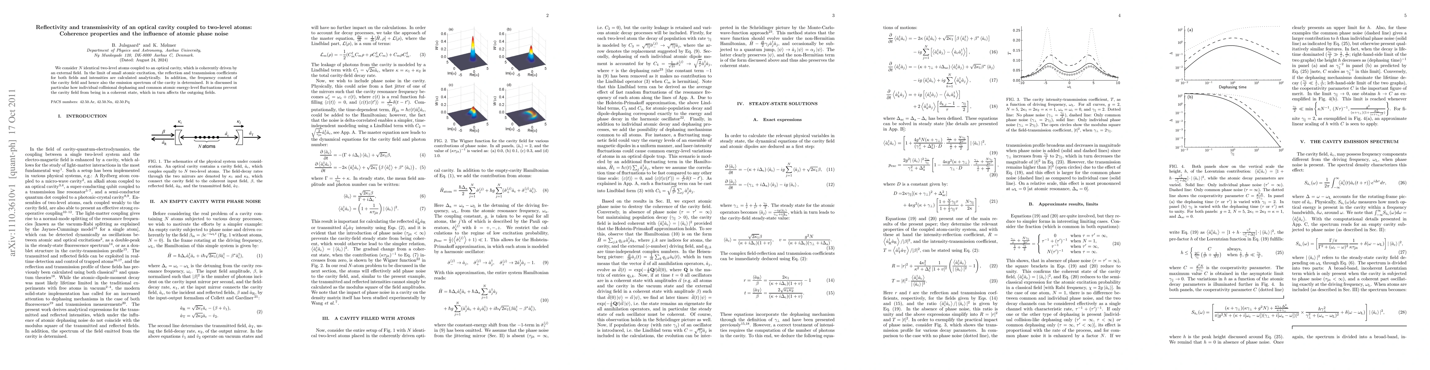 We consider N identical two-level atoms coupled to an optical cavity, which is coherently driven by an external field. In the limit of small atomic excitation, the reflection and transmission coefficients for both fields and intensities are calculated analytically. In addition, the frequency content of the cavity field and hence also the emission spectrum of the cavity is determined. It is discussed in particular how individual collisional dephasing and common atomic energy-level fluctuations prevent the cavity field from being in a coherent state, which in turn affects the outgoing fields.