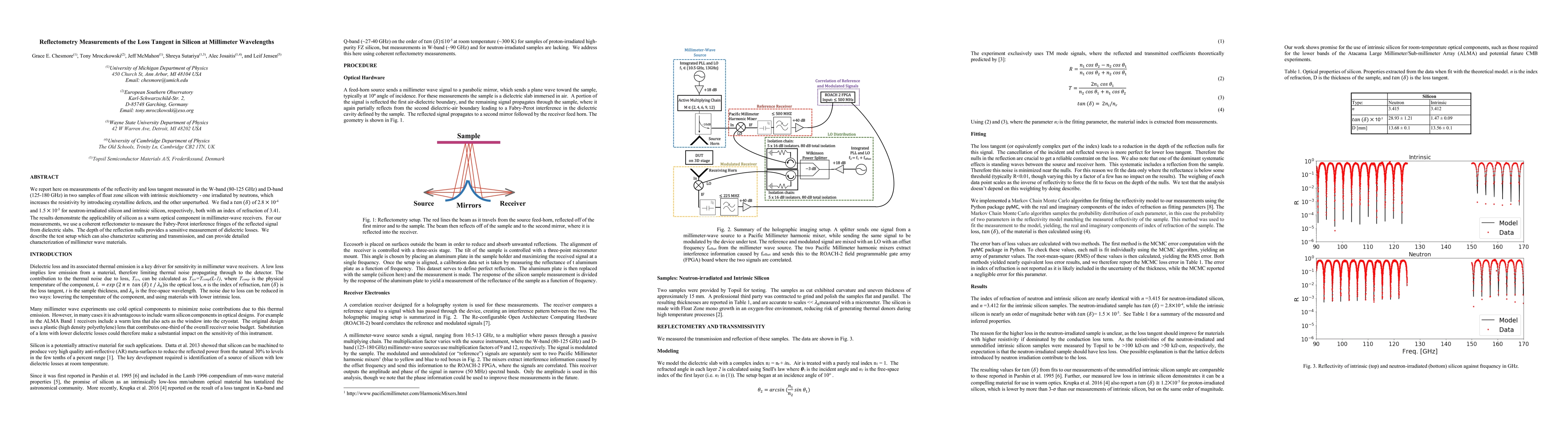 This study measures the reflectivity and loss tangent of float zone silicon in the W-band and D-band using reflectometry, finding a loss tangent of 2.8e-4 for neutron-irradiated silicon and 1.5e-5 for intrinsic silicon, demonstrating silicon's potential as a component in millimeter-wave receivers.