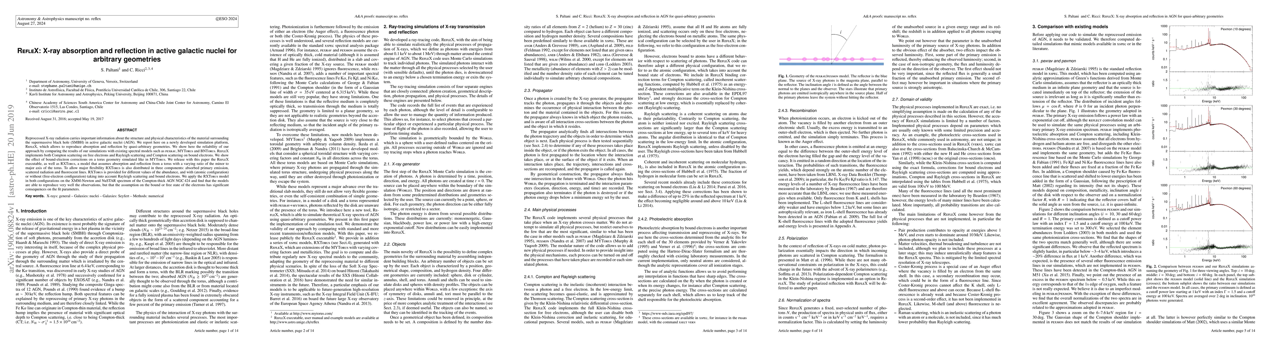 Reprocessed X-ray radiation carries important information about the structure and physical characteristics of the material surrounding the supermassive black hole (SMBH) in active galactic nuclei (AGN). We report here on a newly developed simulation platform, RefleX, which allows to reproduce absorption and reflection by quasi-arbitrary geometries. We show here the reliability of our approach by comparing the results of our simulations with existing spectral models such as pexrav, MYTorus and BNTorus. RefleX implements both Compton scattering on free electrons and Rayleigh scattering and Compton scattering on bound electrons. We show the effect of bound-electron corrections on a torus geometry simulated like in MYTorus. We release with this paper the RefleX executable, as well as RXTorus, a model that assumes absorption and reflection from a torus with a varying ratio of the minor to major axis of the torus. To allow major flexibility RXTorus is also distributed in three components: absorbed primary emission, scattered radiation and fluorescent lines. RXTorus is provided for different values of the abundance, and with (atomic configuration) or without (free-electron configuration) taking into account Rayleigh scattering and bound electrons. We apply the RXTorus model in both configurations on the XMM-Newton and NuSTAR spectrum of the Compton-thick AGN NGC 424 and find that the models are able to reproduce very well the observations, but that the assumption on the bound or free state of the electrons has significant consequences on the fit parameters.