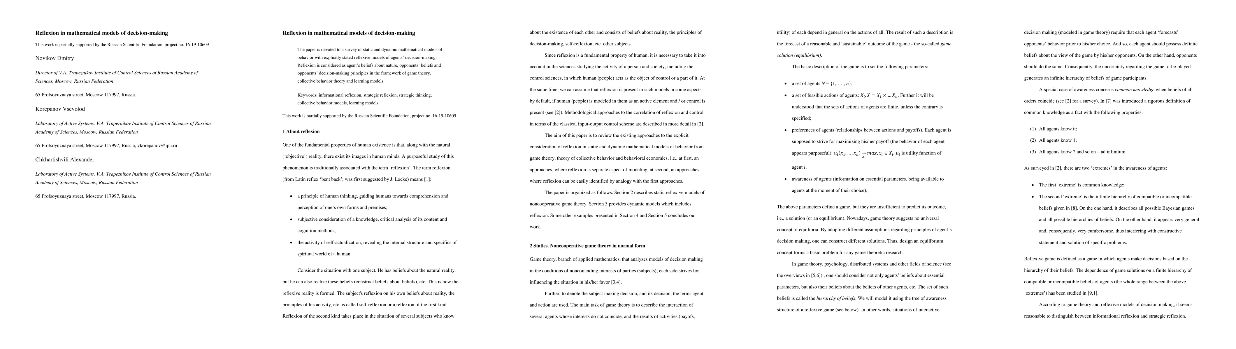 This paper generalizes static and dynamic mathematical models of decision-making, incorporating reflexive models where agents consider their beliefs about nature, opponents' beliefs, and decision-making principles within game theory, collective behavior, and learning frameworks.
