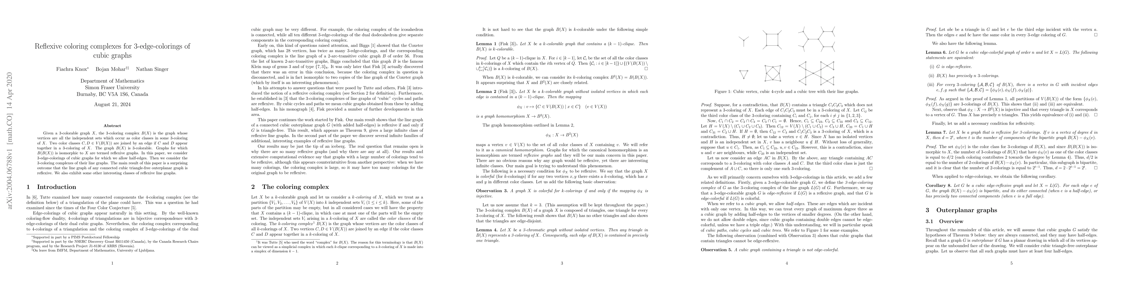 This paper explores 3-edge-colorings of cubic graphs, specifically focusing on reflexive coloring complexes where the complex of color classes in line graphs of connected cubic triangle-free outerplanar graphs is isomorphic to the original graph. The main result demonstrates that such line graphs are reflexive.